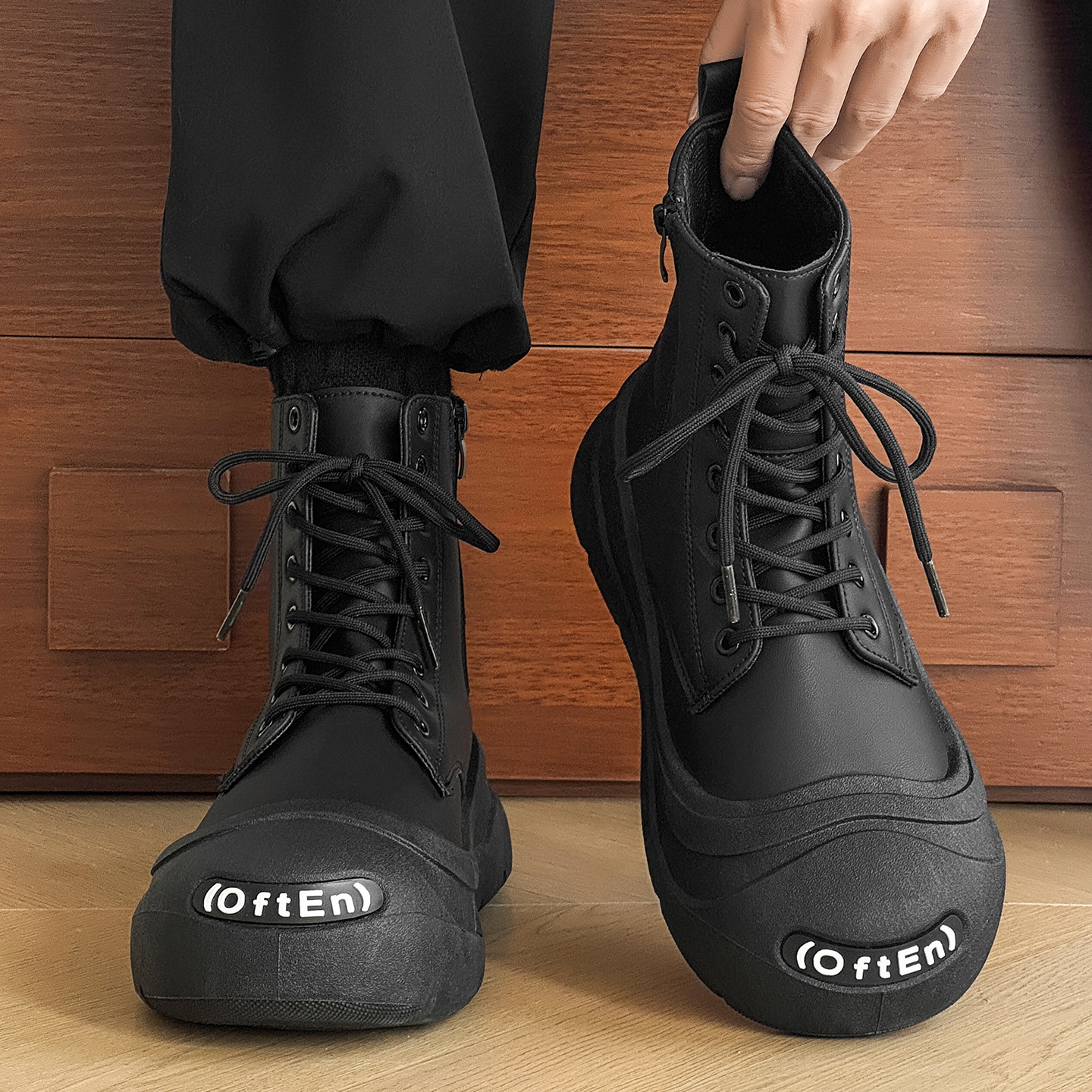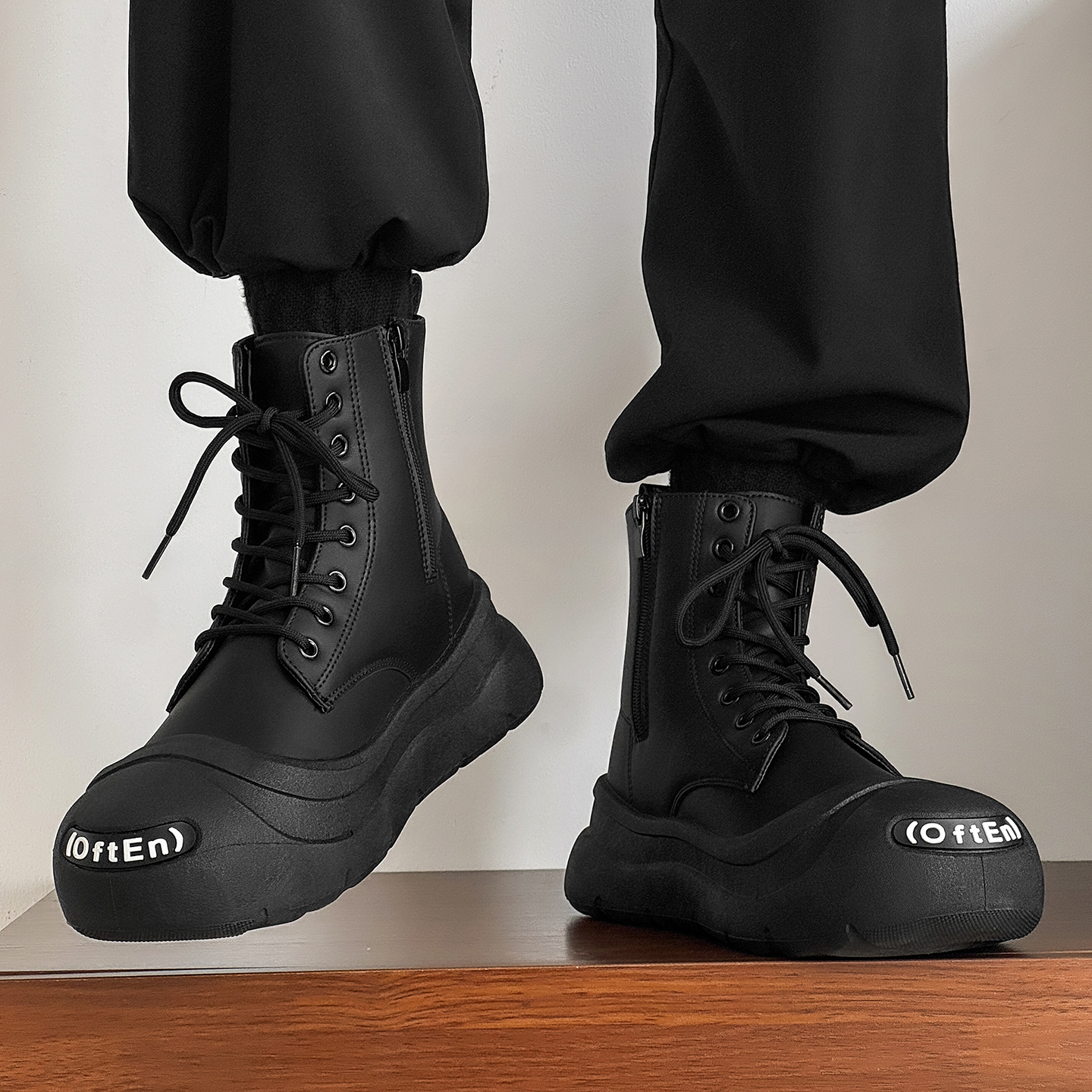 休闲运动厚底皮面板鞋 高帮男鞋 机车马丁靴男款 潮流黑色工装 秋冬季