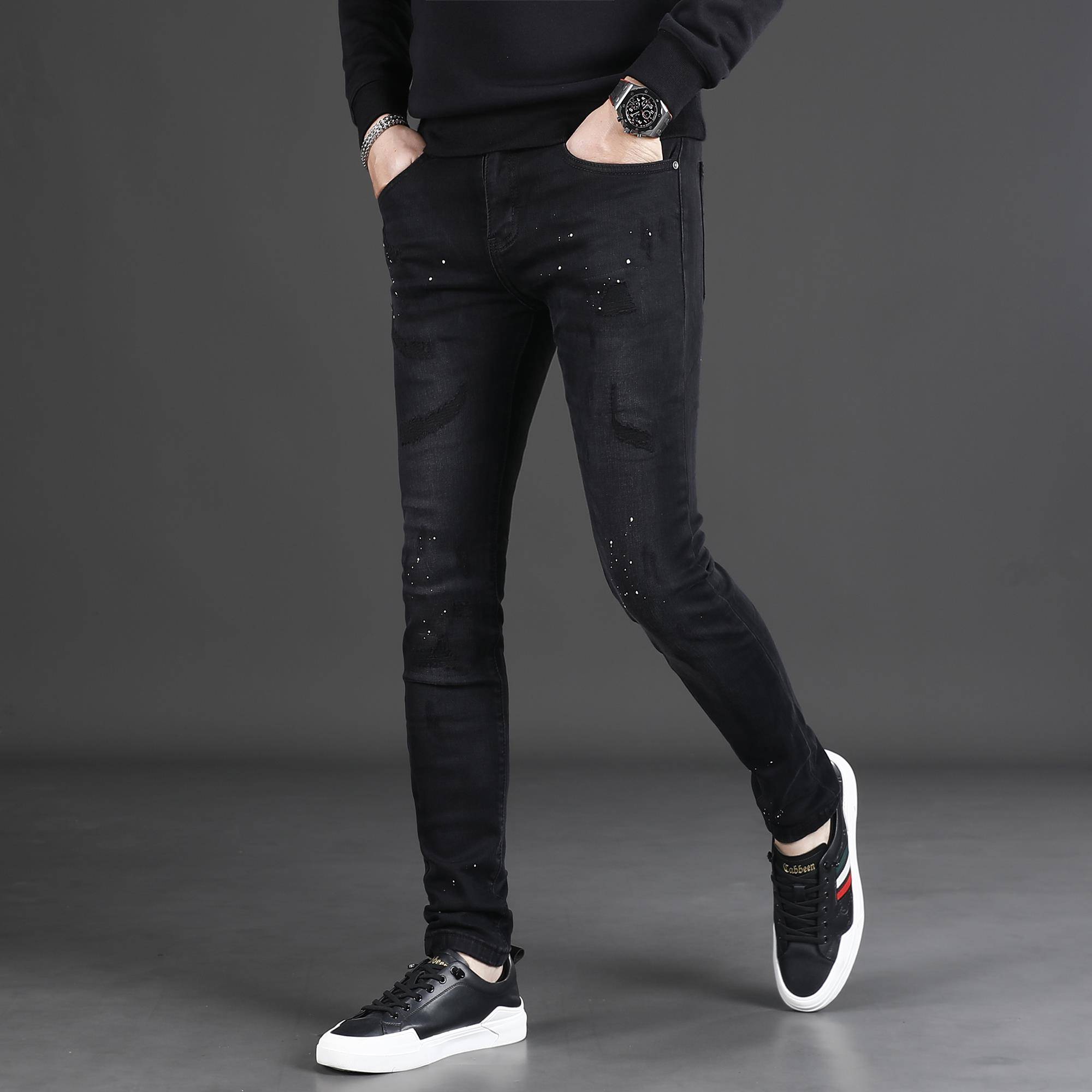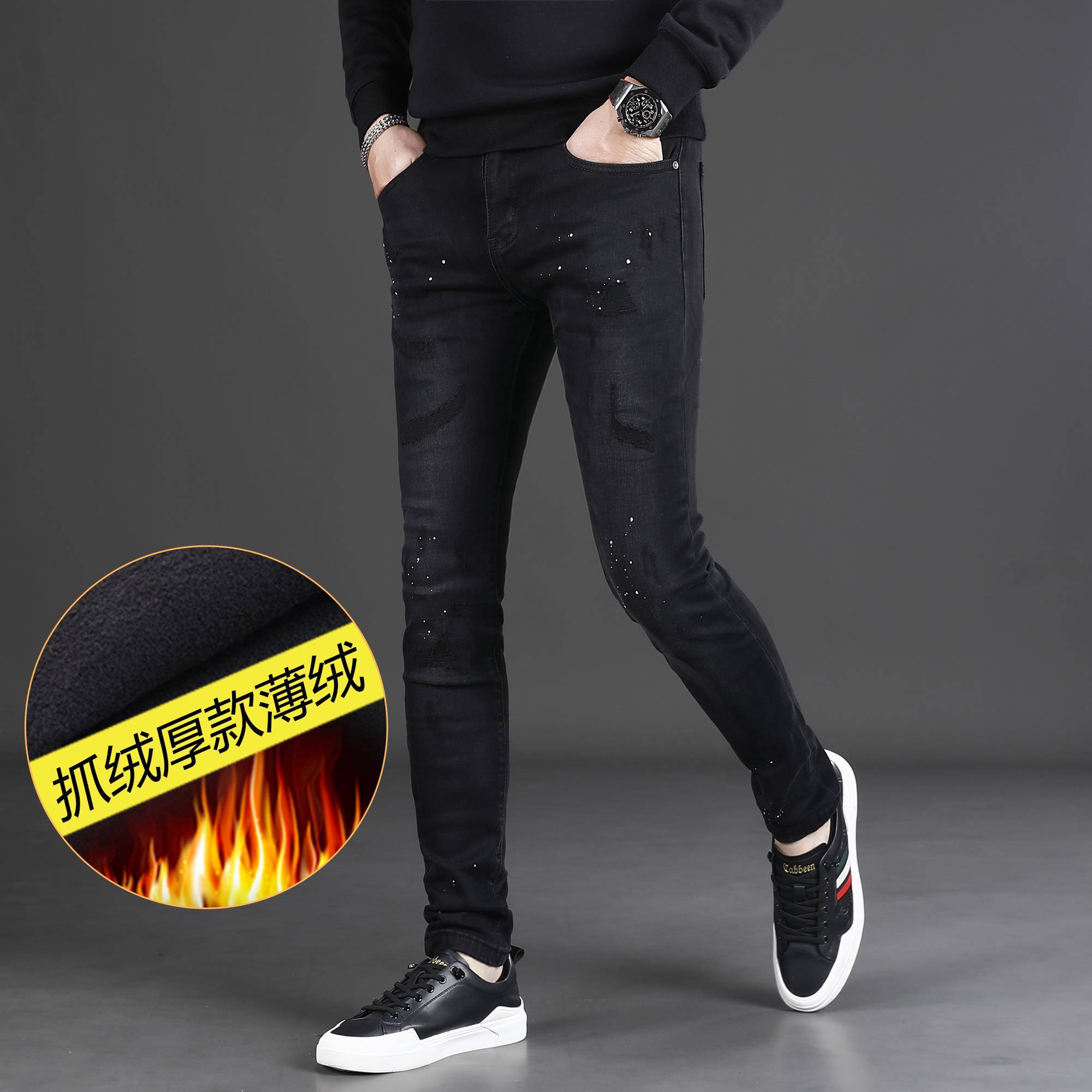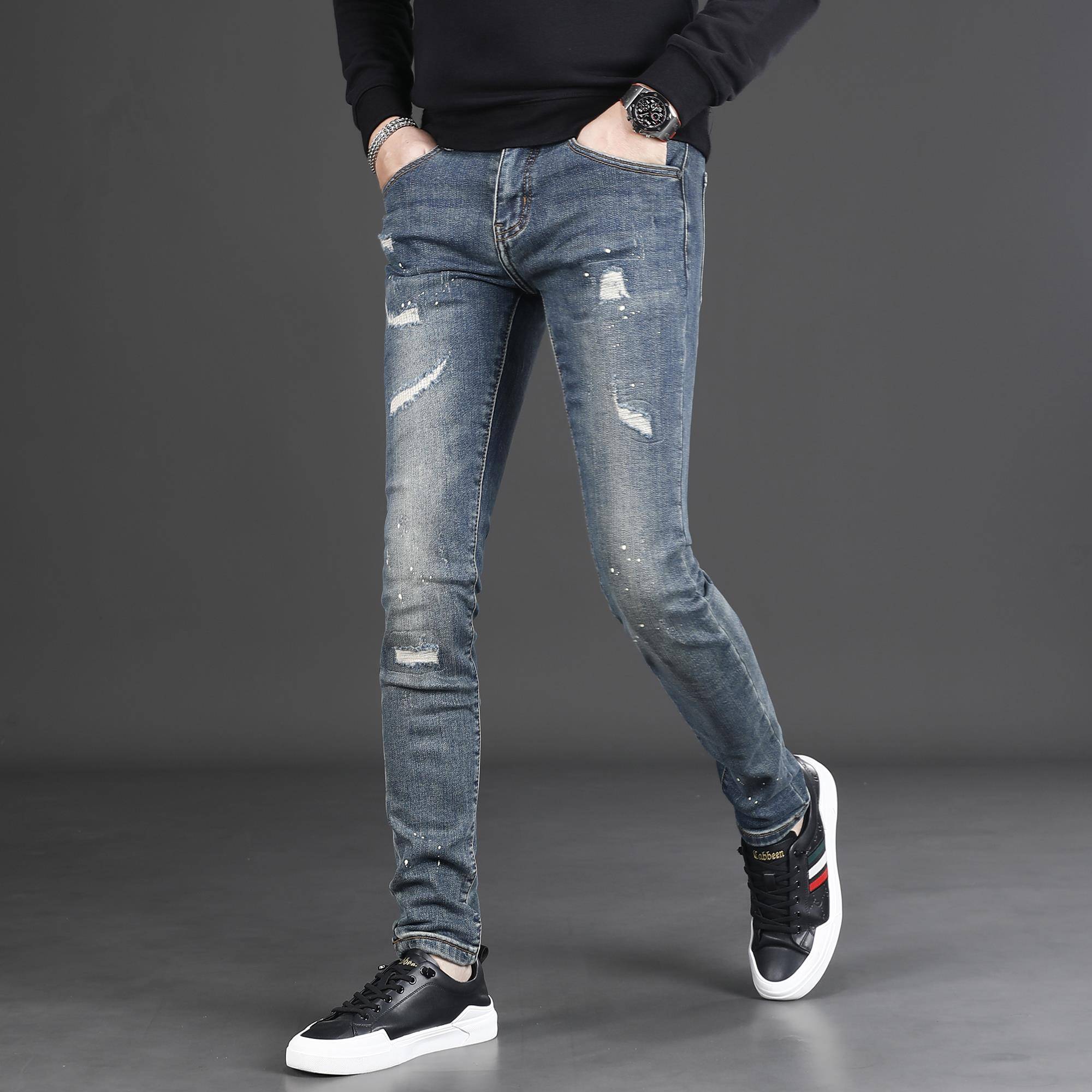 男款 裤 秋冬加绒修身 潮流男士 1018h 小脚裤 高端蓝色破洞补丁牛仔裤