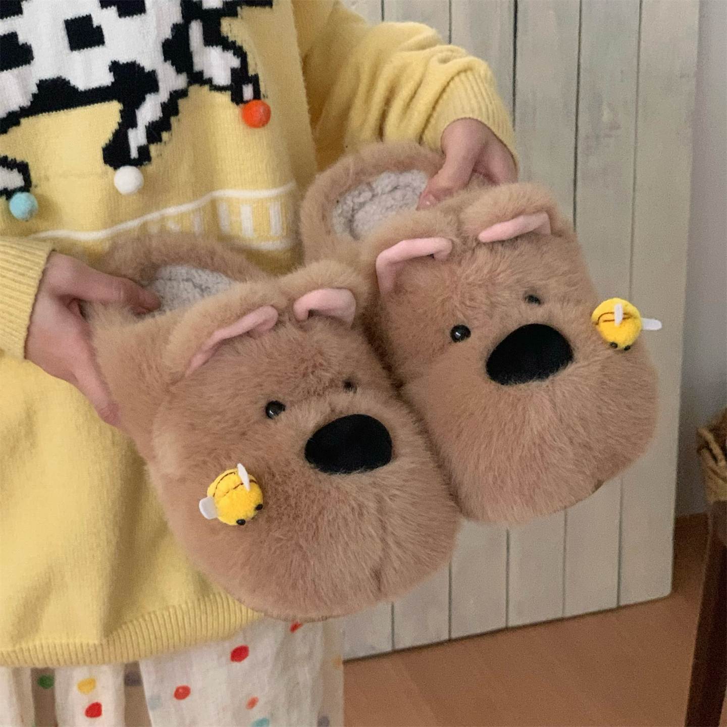 男女冬ins可爱情侣居家毛毛鞋 细细条被蜜蜂蛰 西高地小狗棉拖鞋
