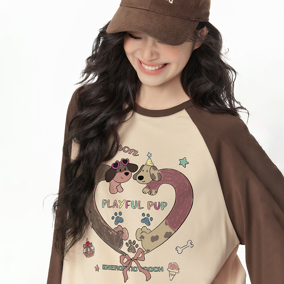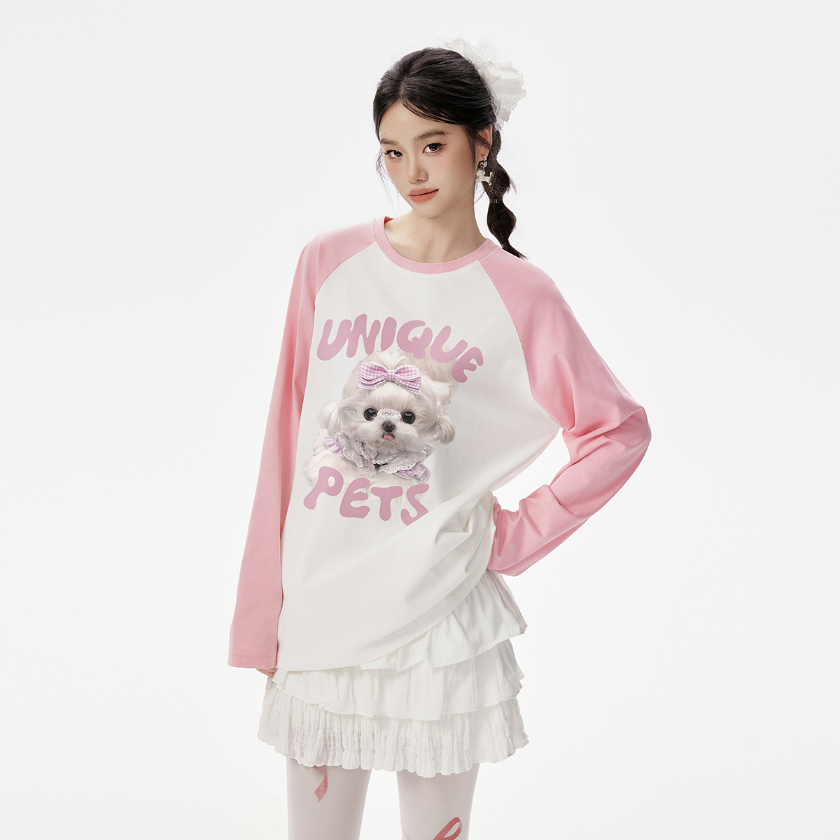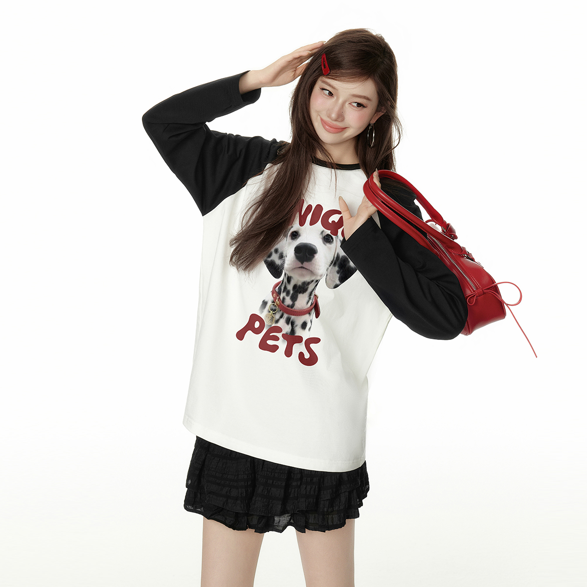 可爱小狗印花插肩袖 新款 宽松纯棉上衣 T恤女2025秋季 EPTISON长袖