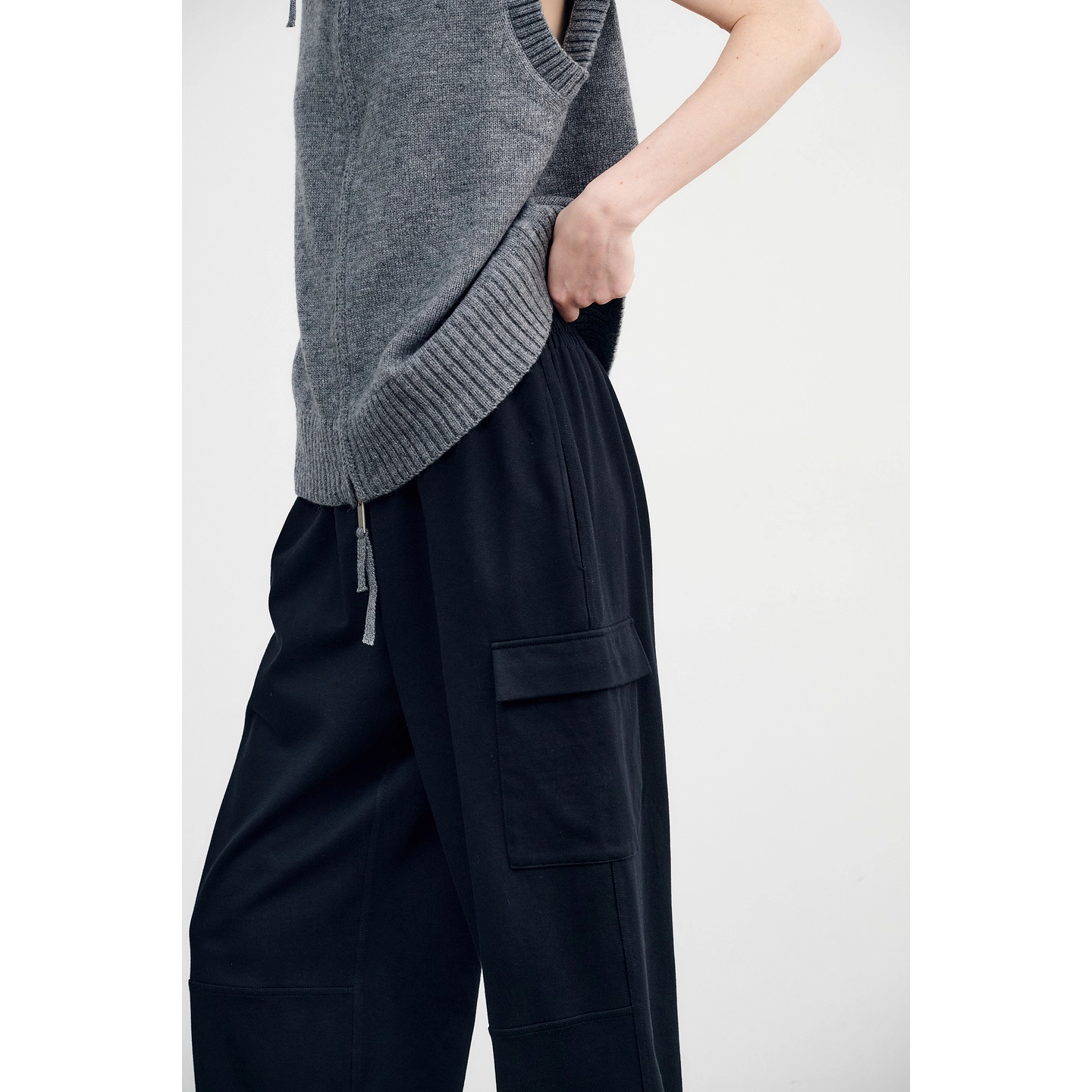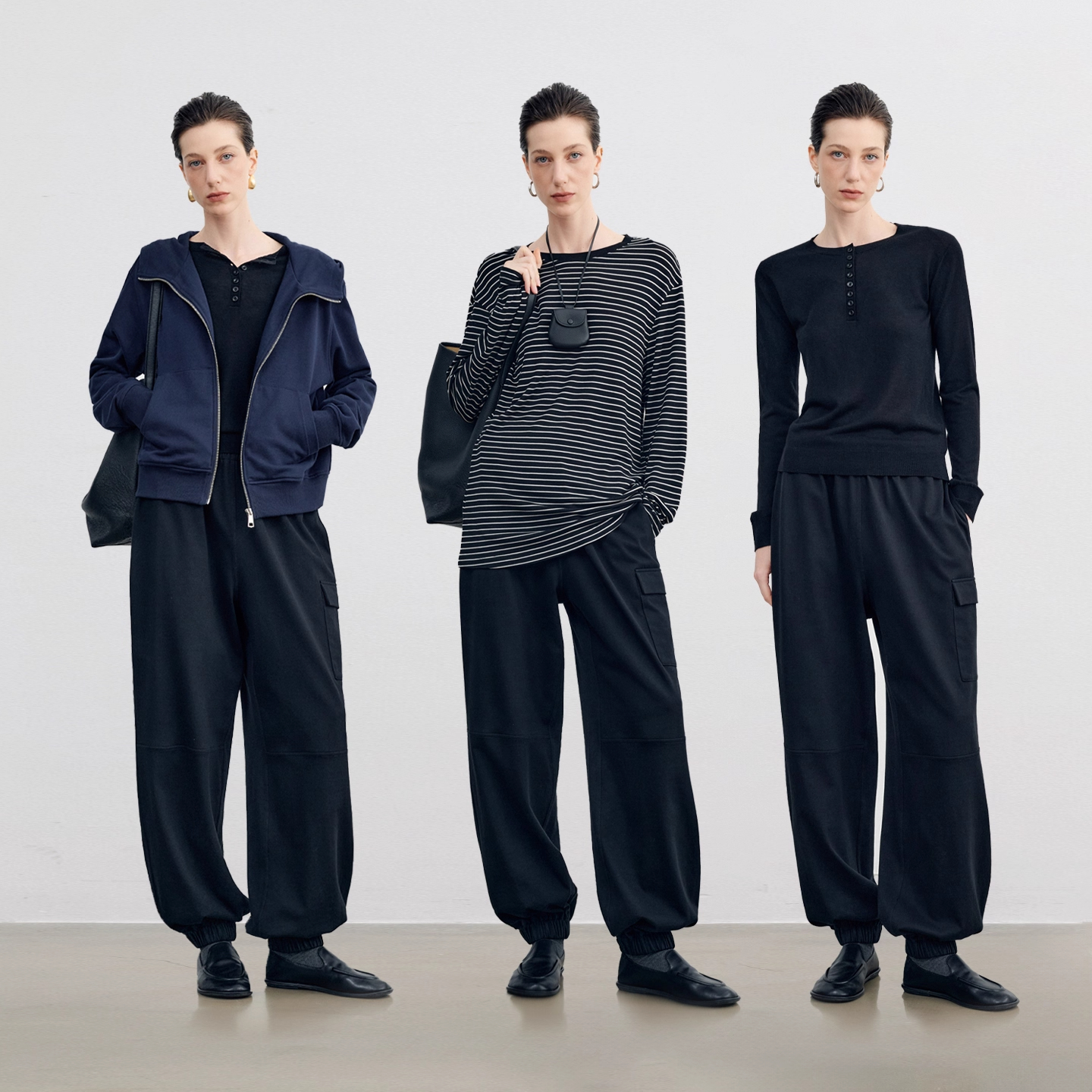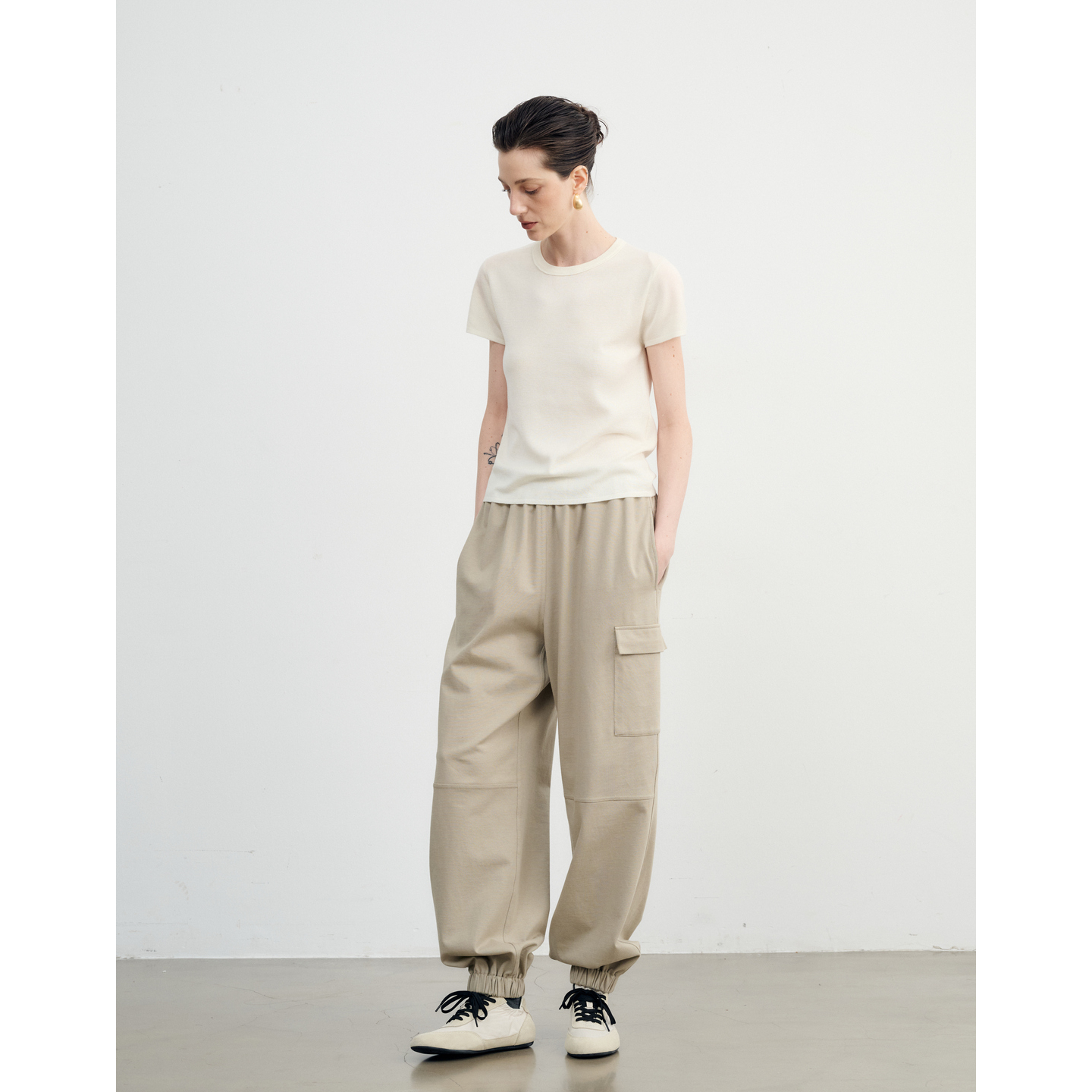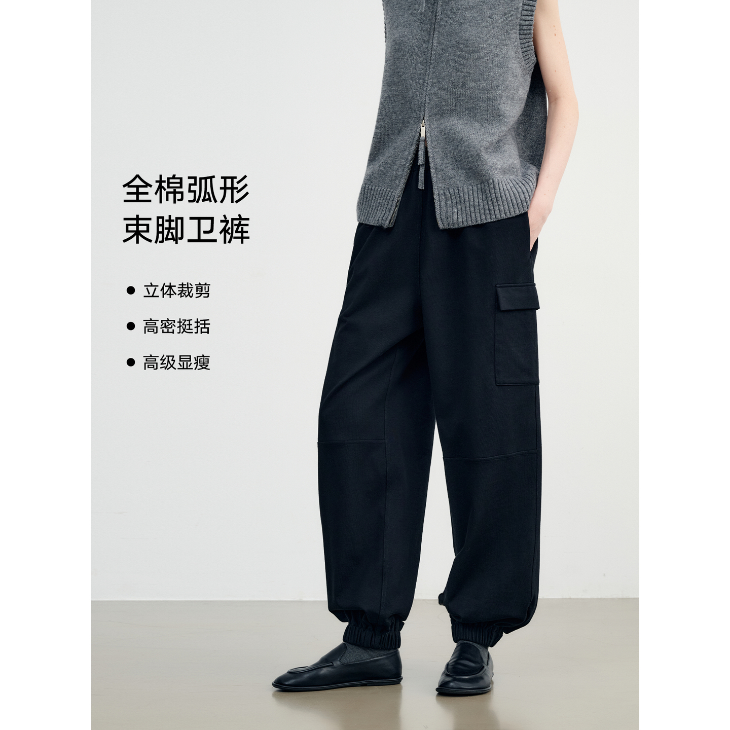 全棉弧形口袋长裤 百家好百搭纯色松紧腰束脚休闲裤 女 House Basic