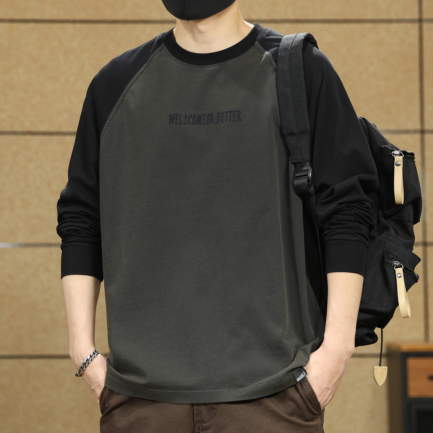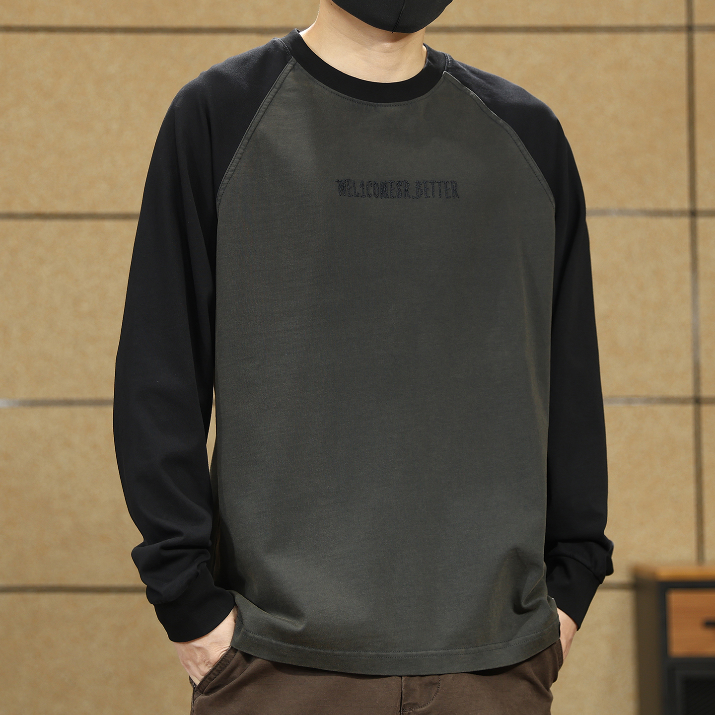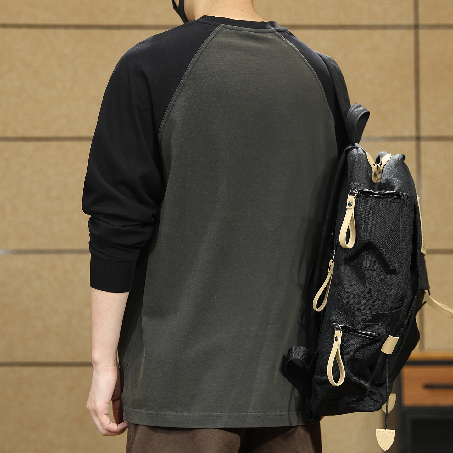 宽松重磅纯棉打底衫 T恤男春秋新款 复古水洗插肩撞色长袖 高端美式