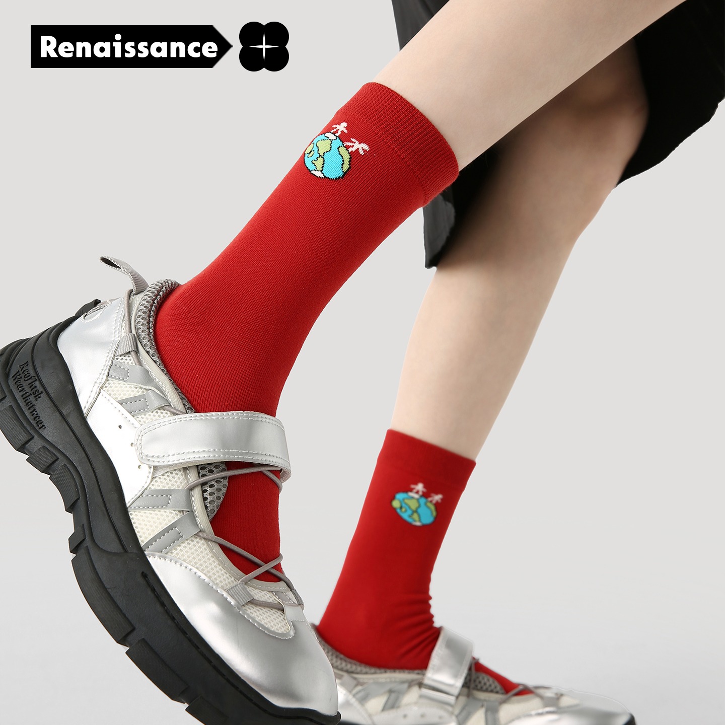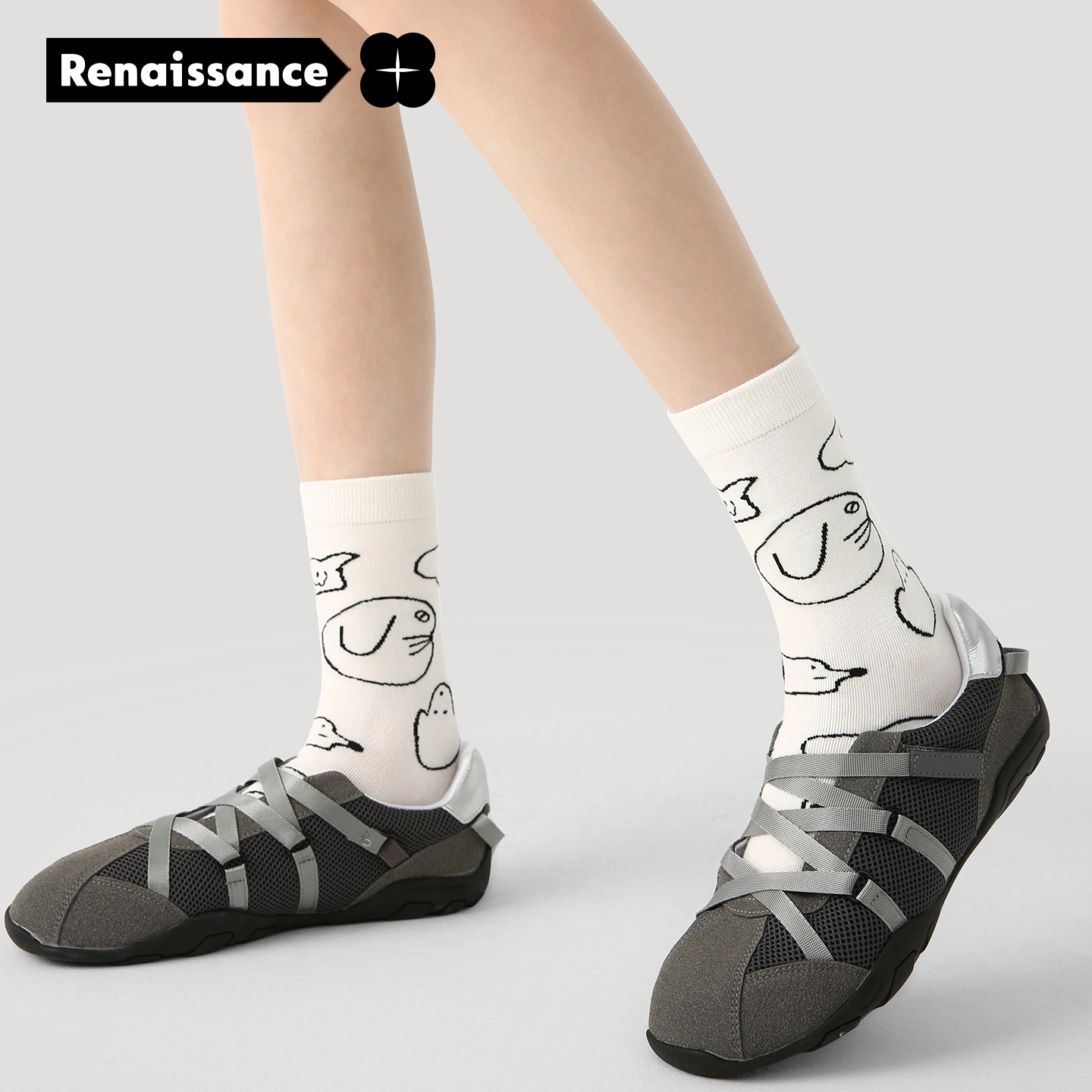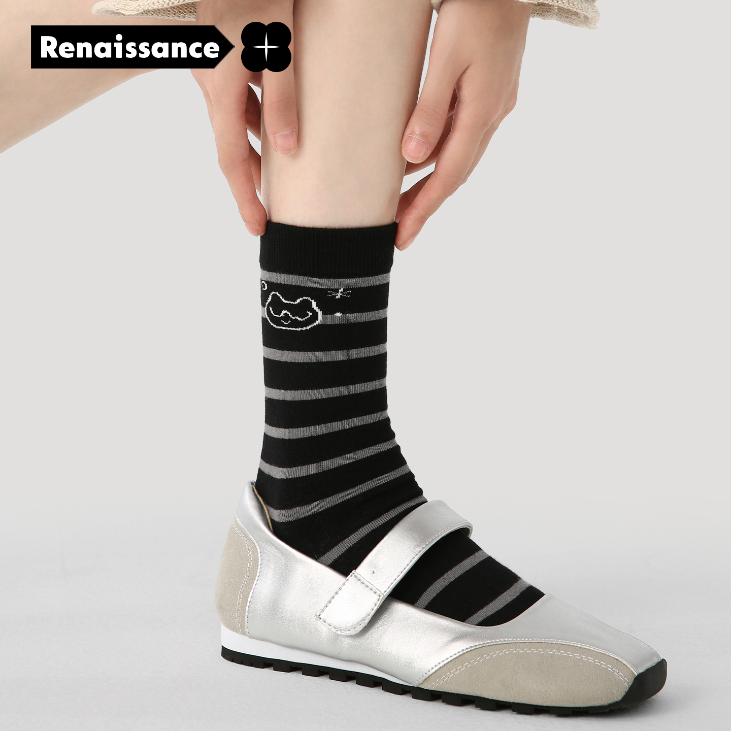 中筒袜 袜子女条纹插画风卡通堆堆袜25春秋款 Renaissance秋季 新品