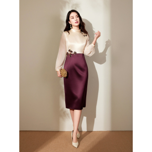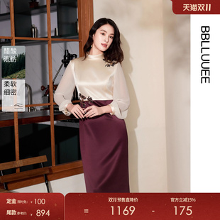 新款 粉蓝衣橱2025秋装 撞色拼接立领刺绣礼服连衣裙女 东方雅致