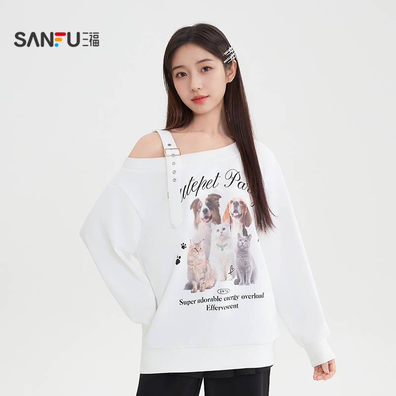 507438 小狗印花宽松蓝色斜肩上衣女装 三福无帽卫衣女2025新款 秋季