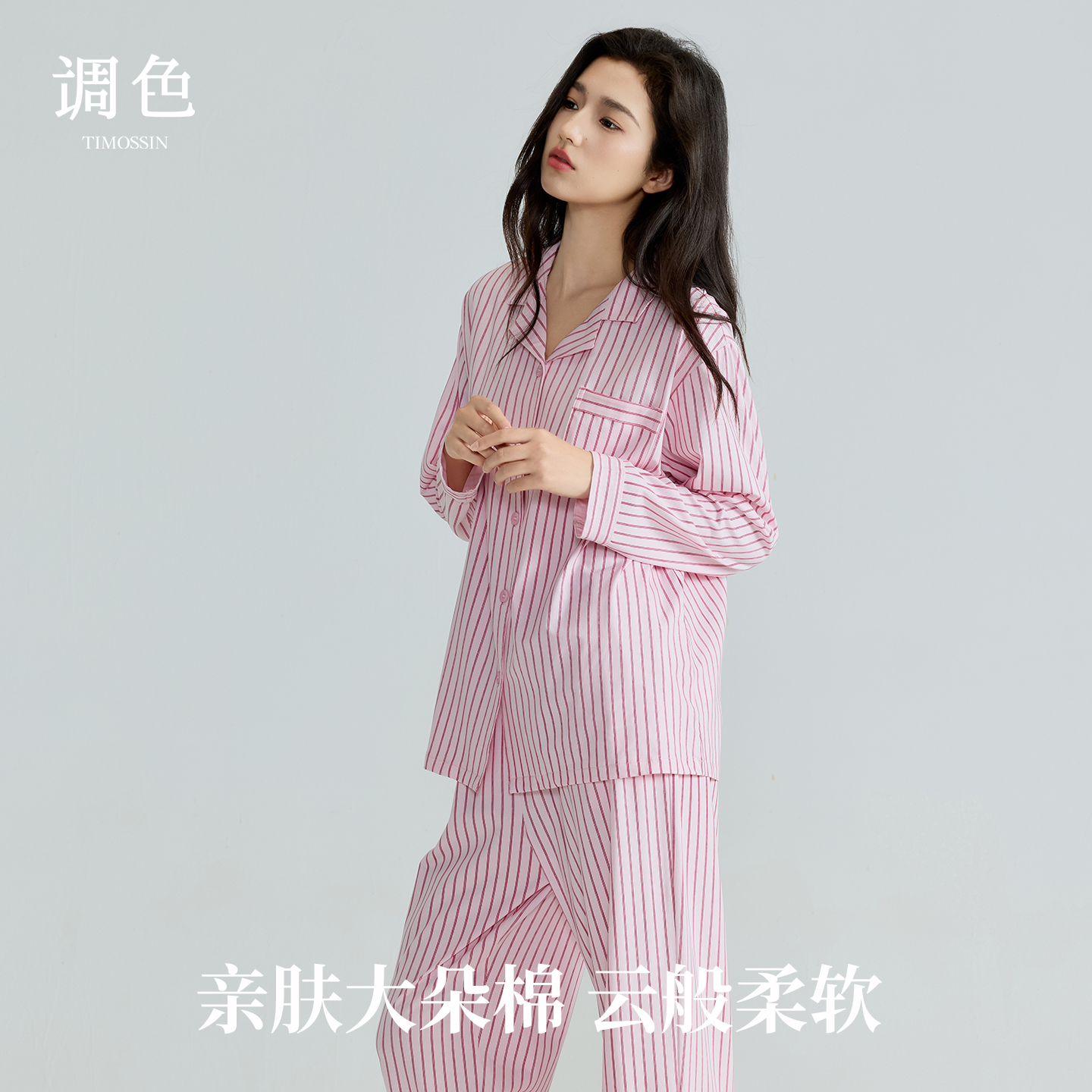 情侣家居服条纹 梭织莱赛尔纯棉长袖 调色女士睡衣女款 2025新款