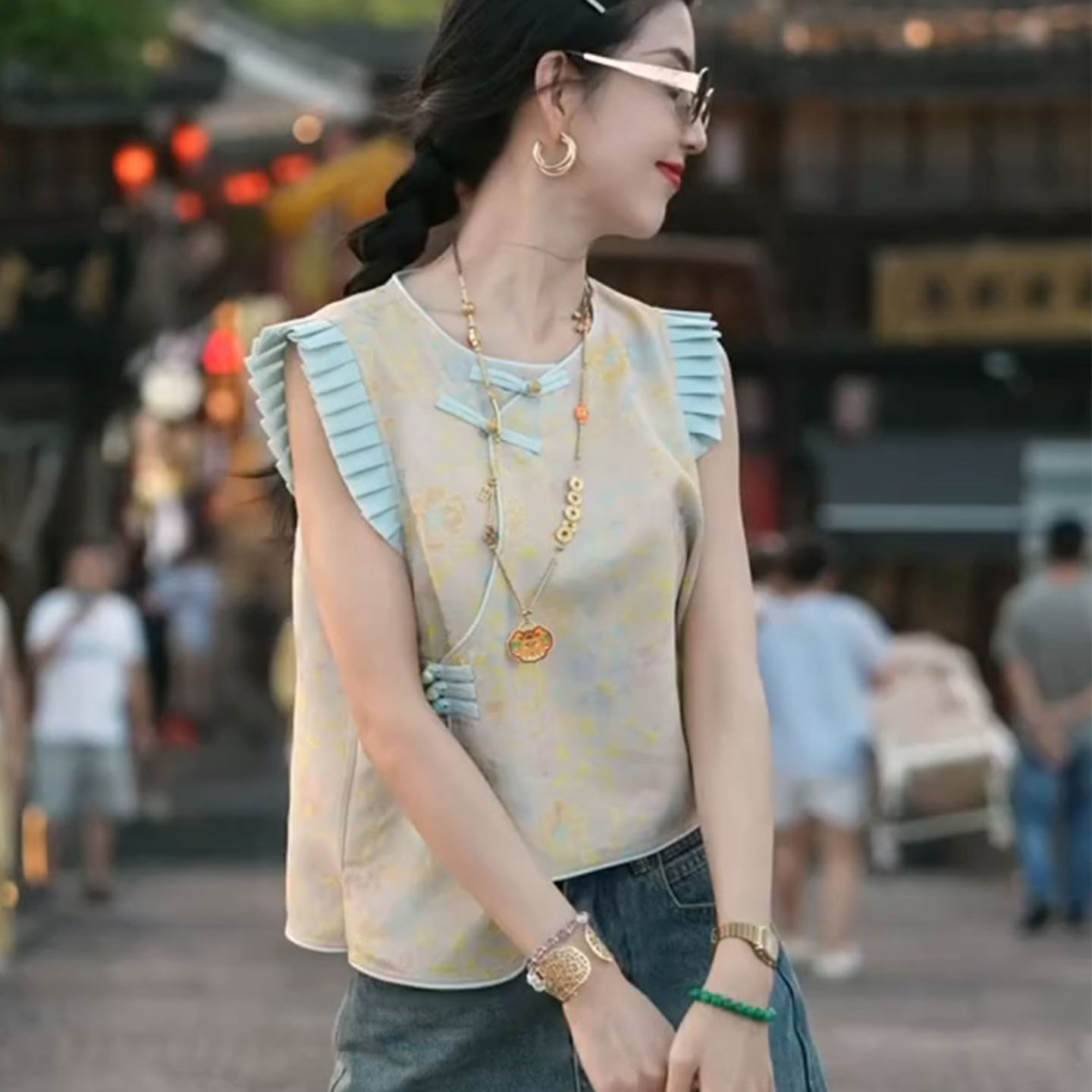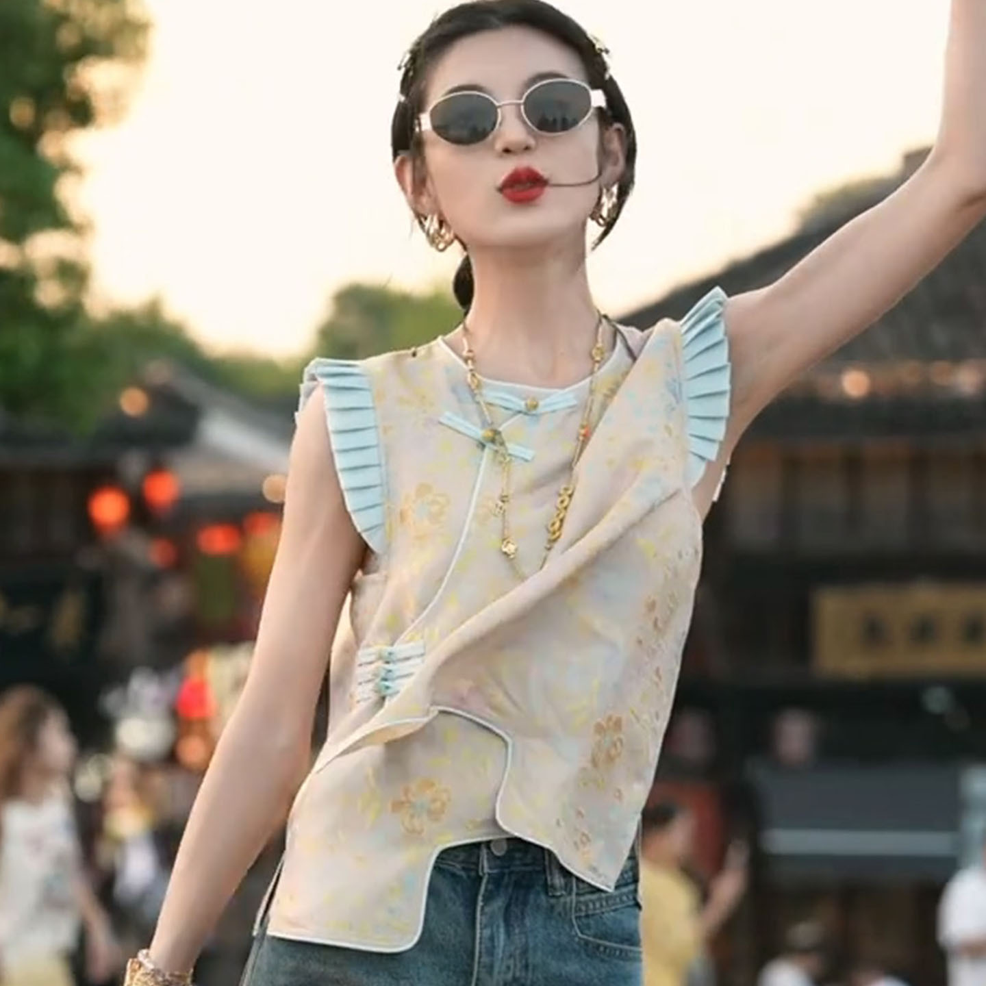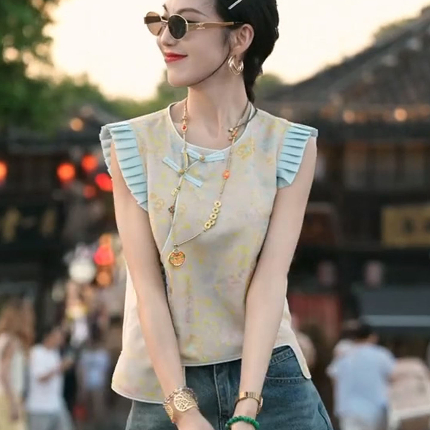 夏年轻少女小飞袖 新中式 2025新款 旗袍改良女装 撞色上衣 轻国风短款