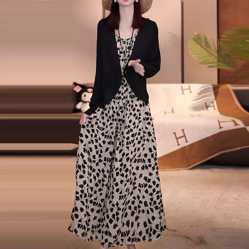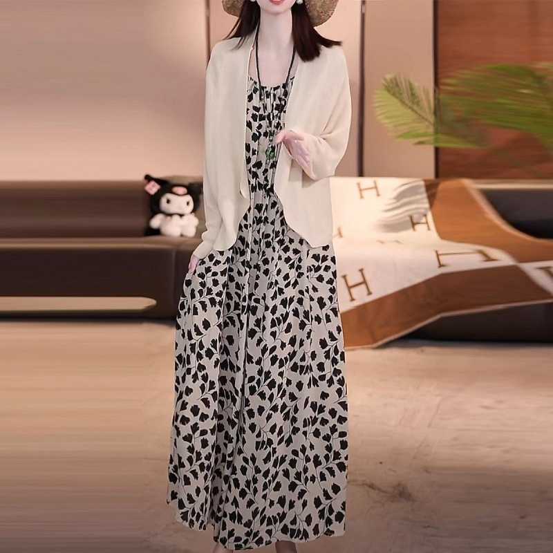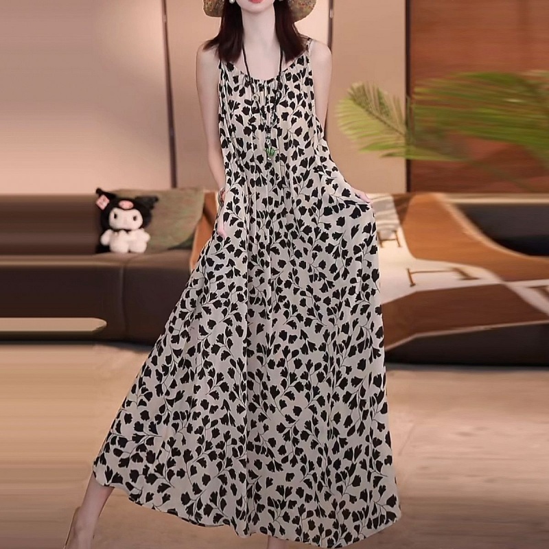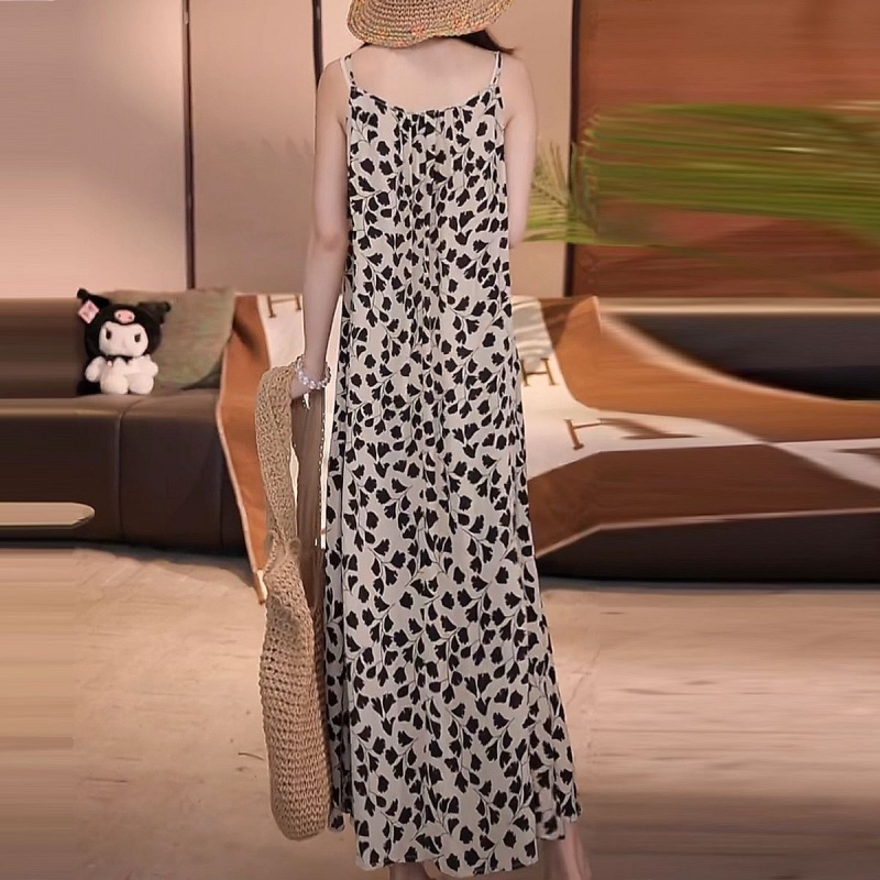 高档海边度假轻奢范轻薄透气吊带连衣裙大码 遮肉显瘦过膝长裙子夏