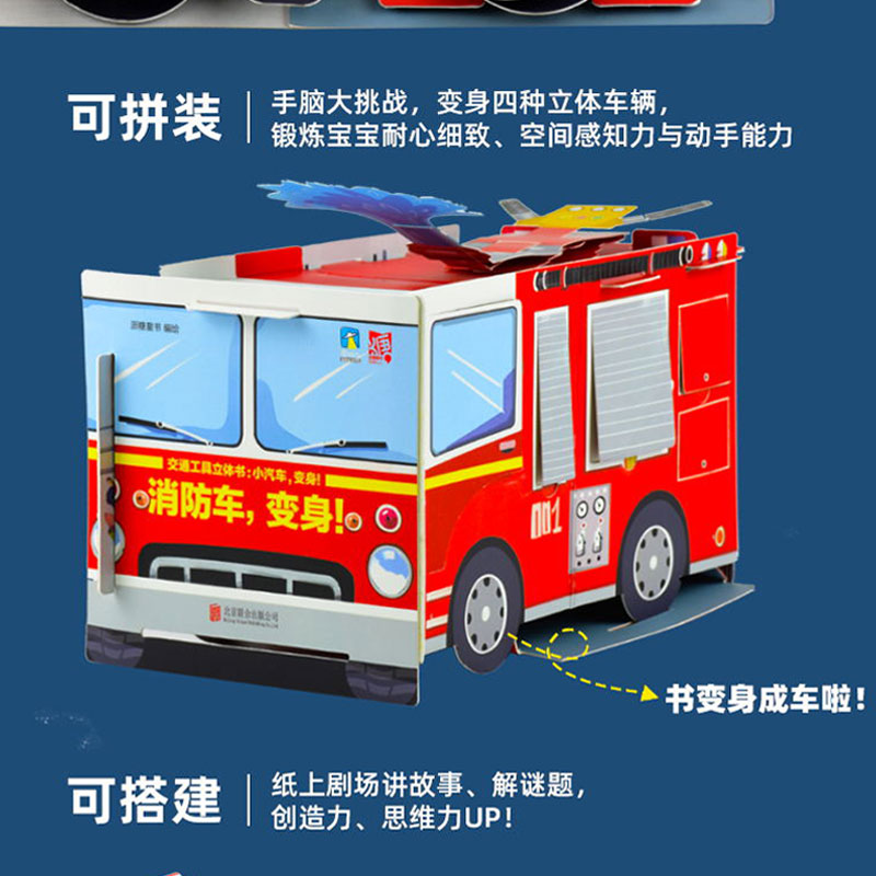 搭建4种车型幼儿早教益智游戏书籍翻翻书赠汽车纸膜 互动机关立体书儿童3d立体书汽车可阅读拼装 交通工具立体书小汽车变身全4册