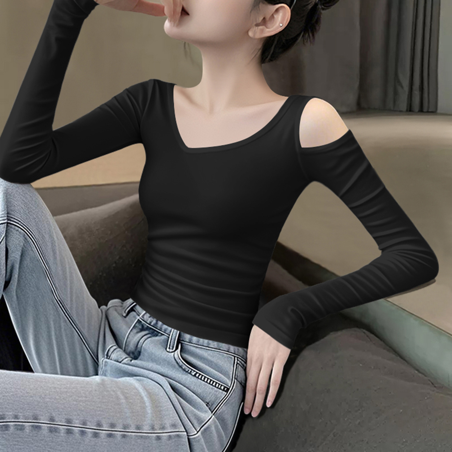 上衣 2025秋冬内搭设计感露肩别致小众修身 斜V领镂空长袖 T恤女新款