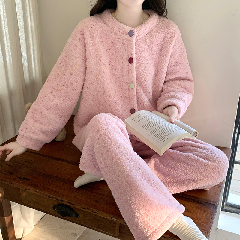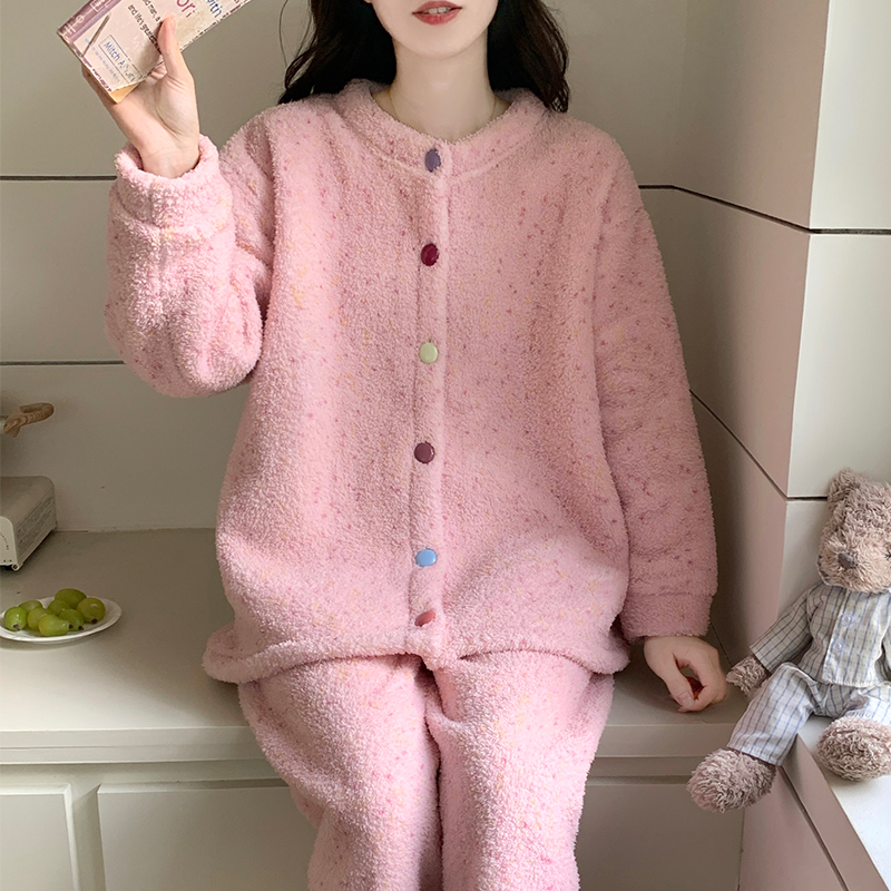 彩色纽扣宽松家居服套装 加厚保暖珊瑚绒新款 秋冬季 半边绒睡衣女款