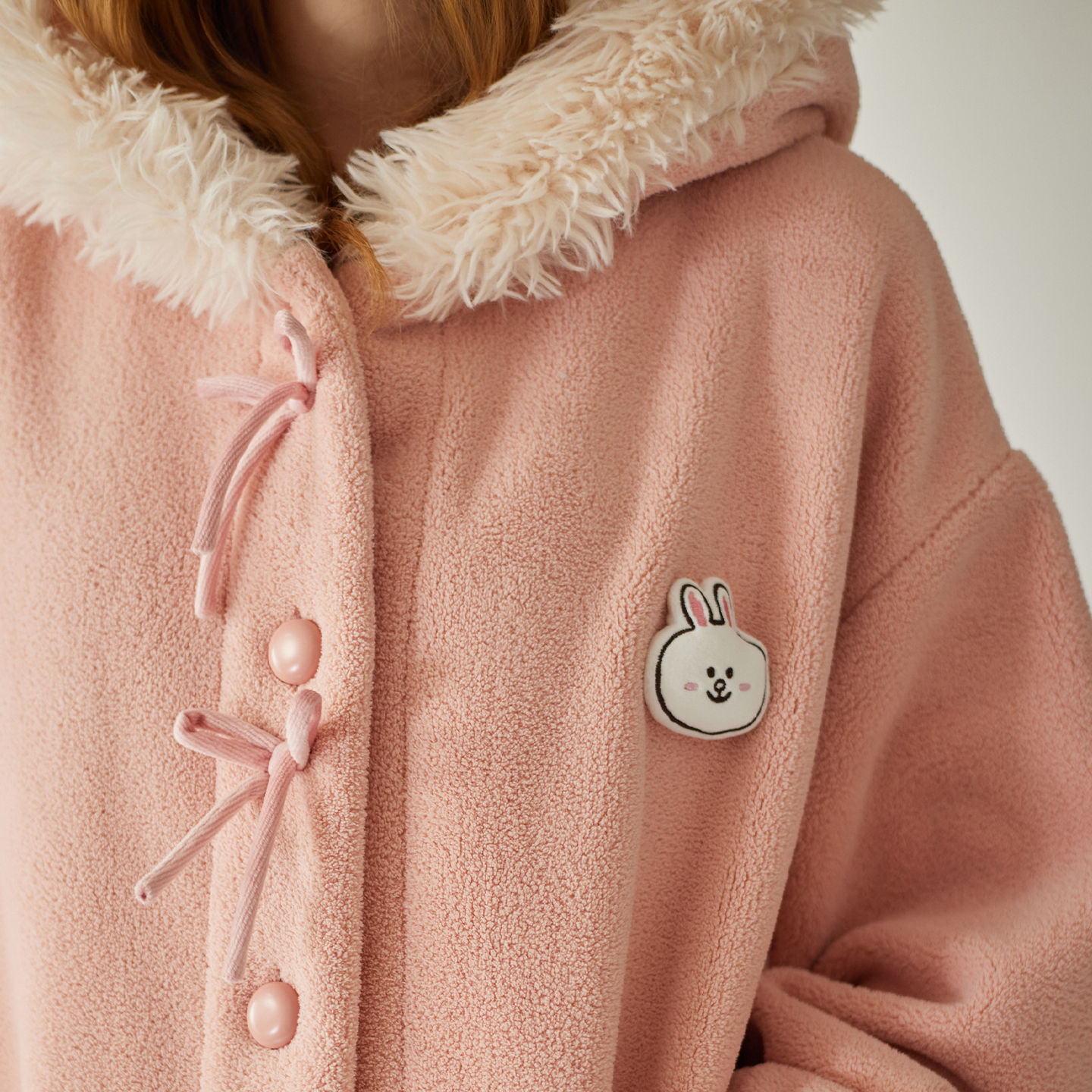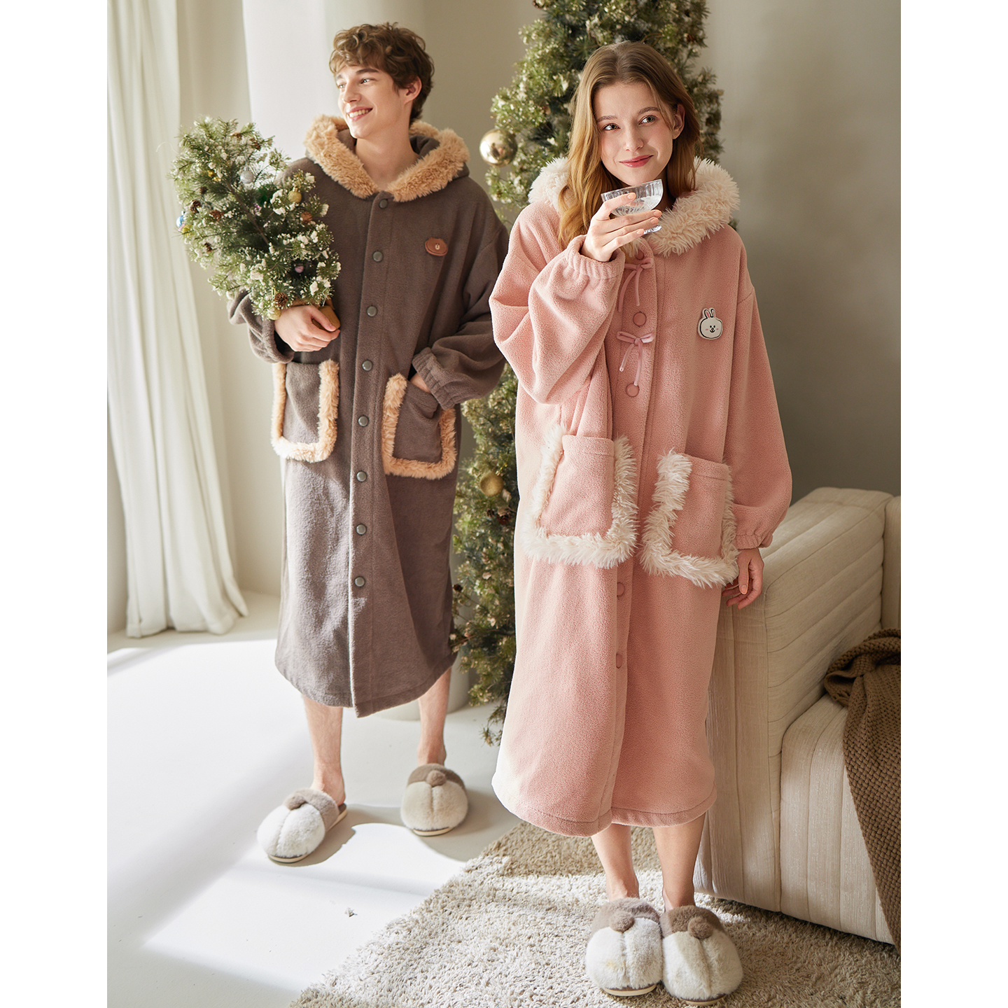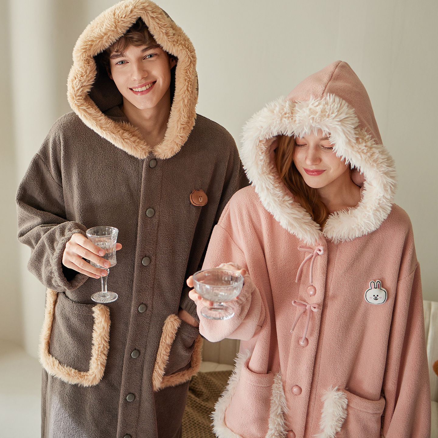 芬腾情侣睡袍秋冬季 珊瑚绒连帽睡衣可爱布朗熊加绒加厚家居服 新款