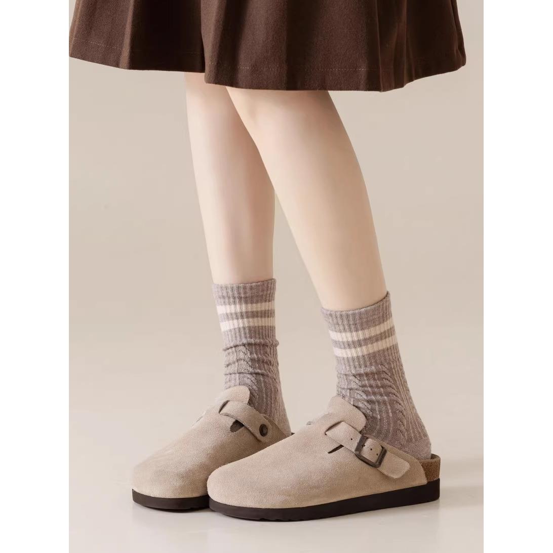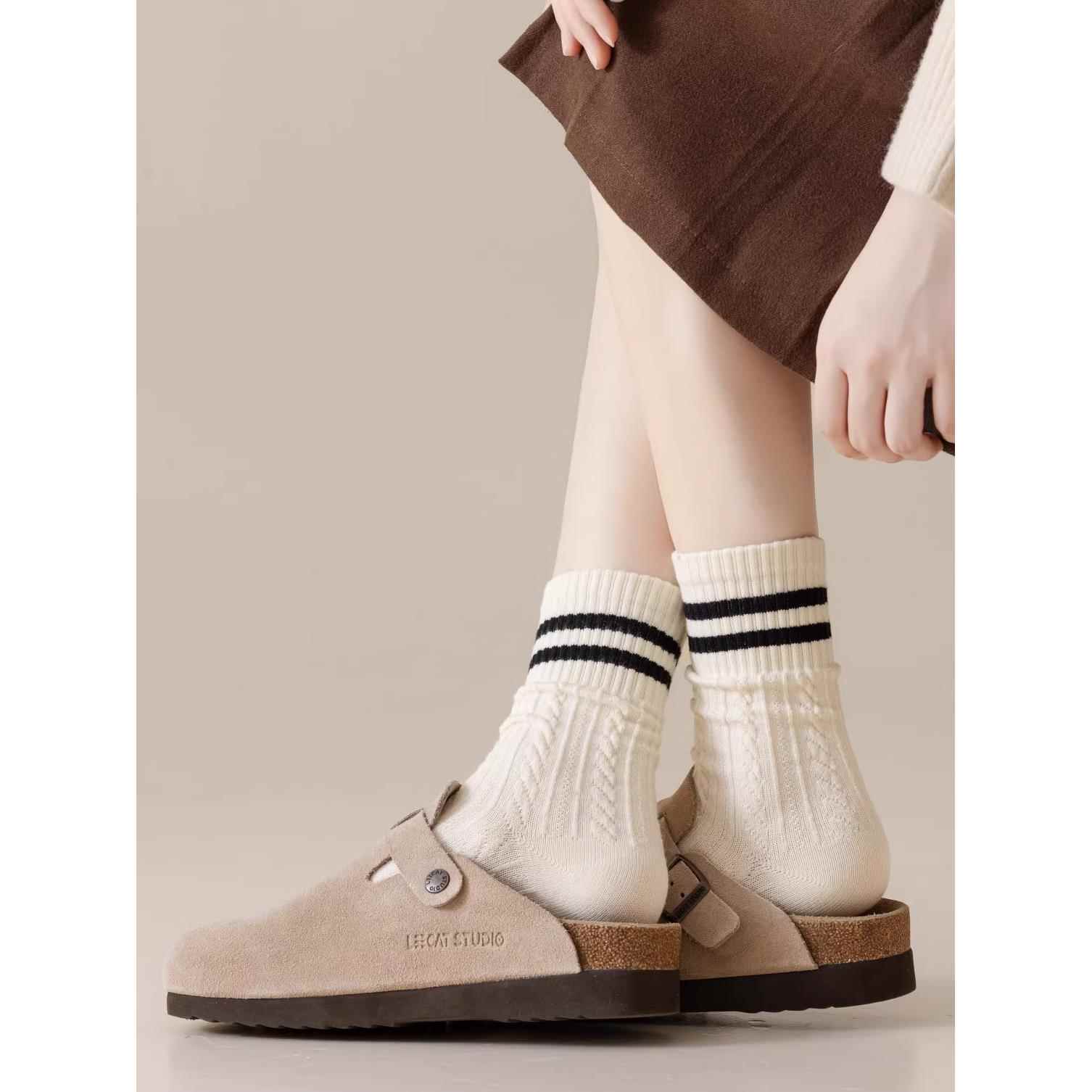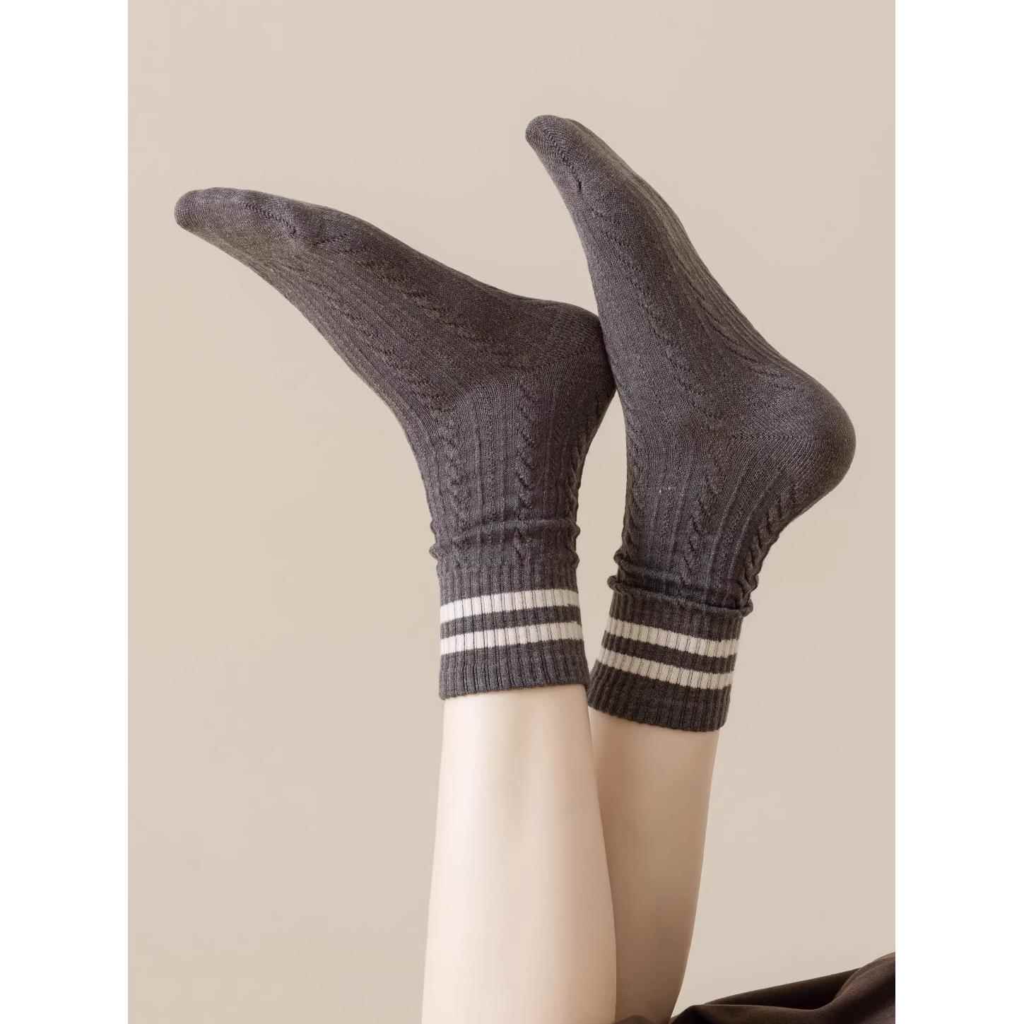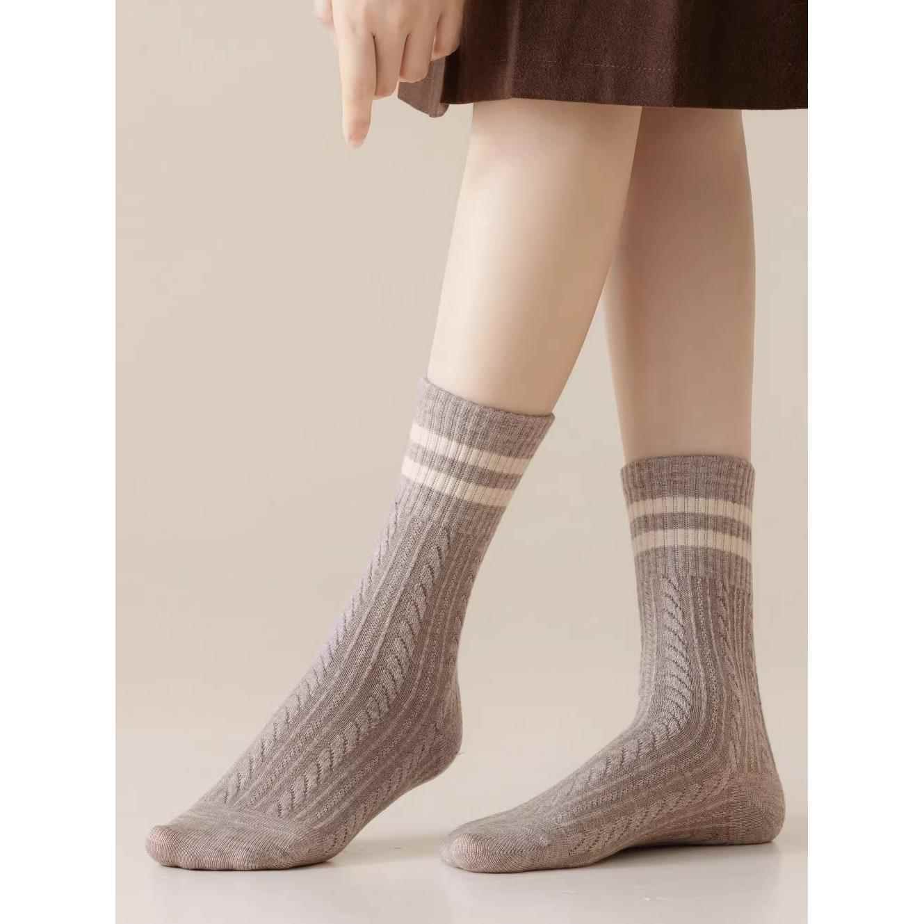 咖色袜子女条纹中筒袜春秋复古美拉德色系双杠麻花堆堆袜配勃肯鞋