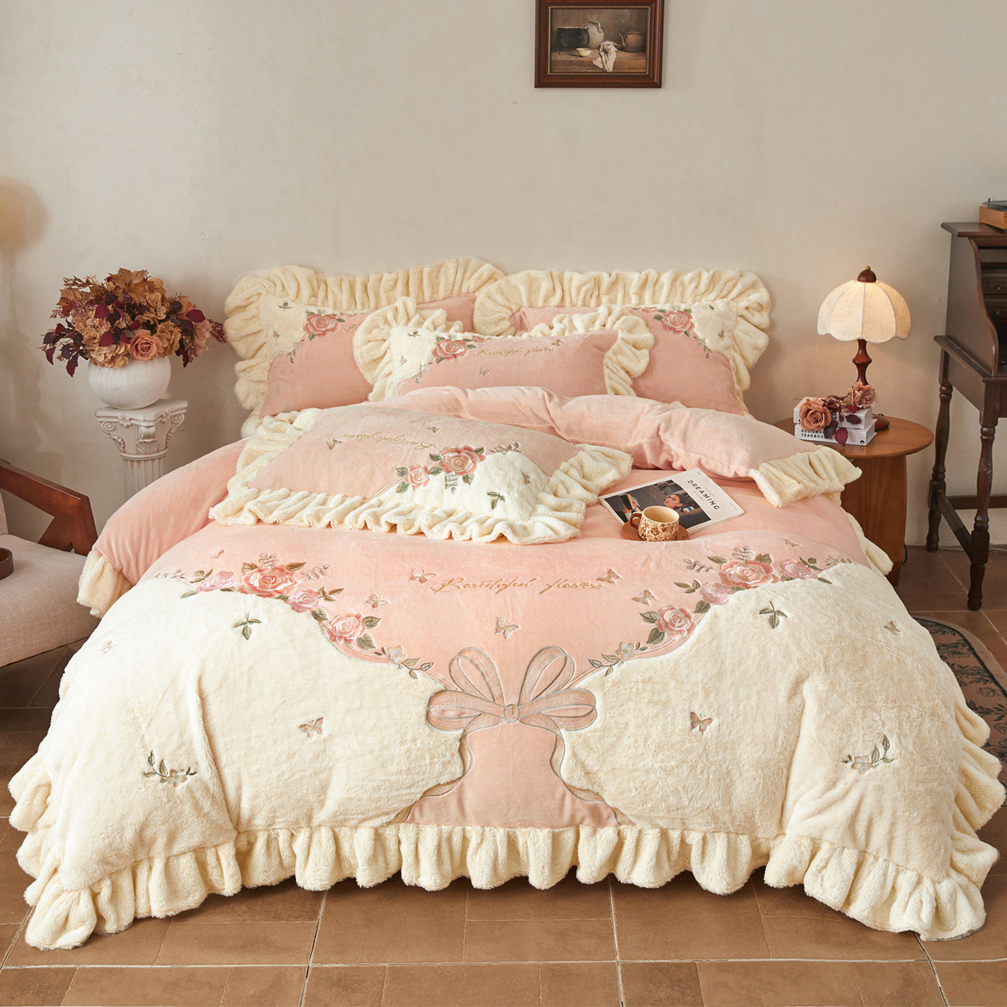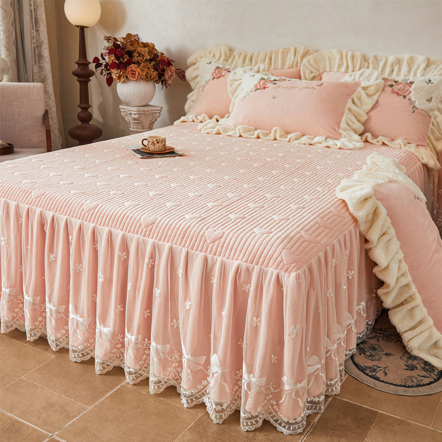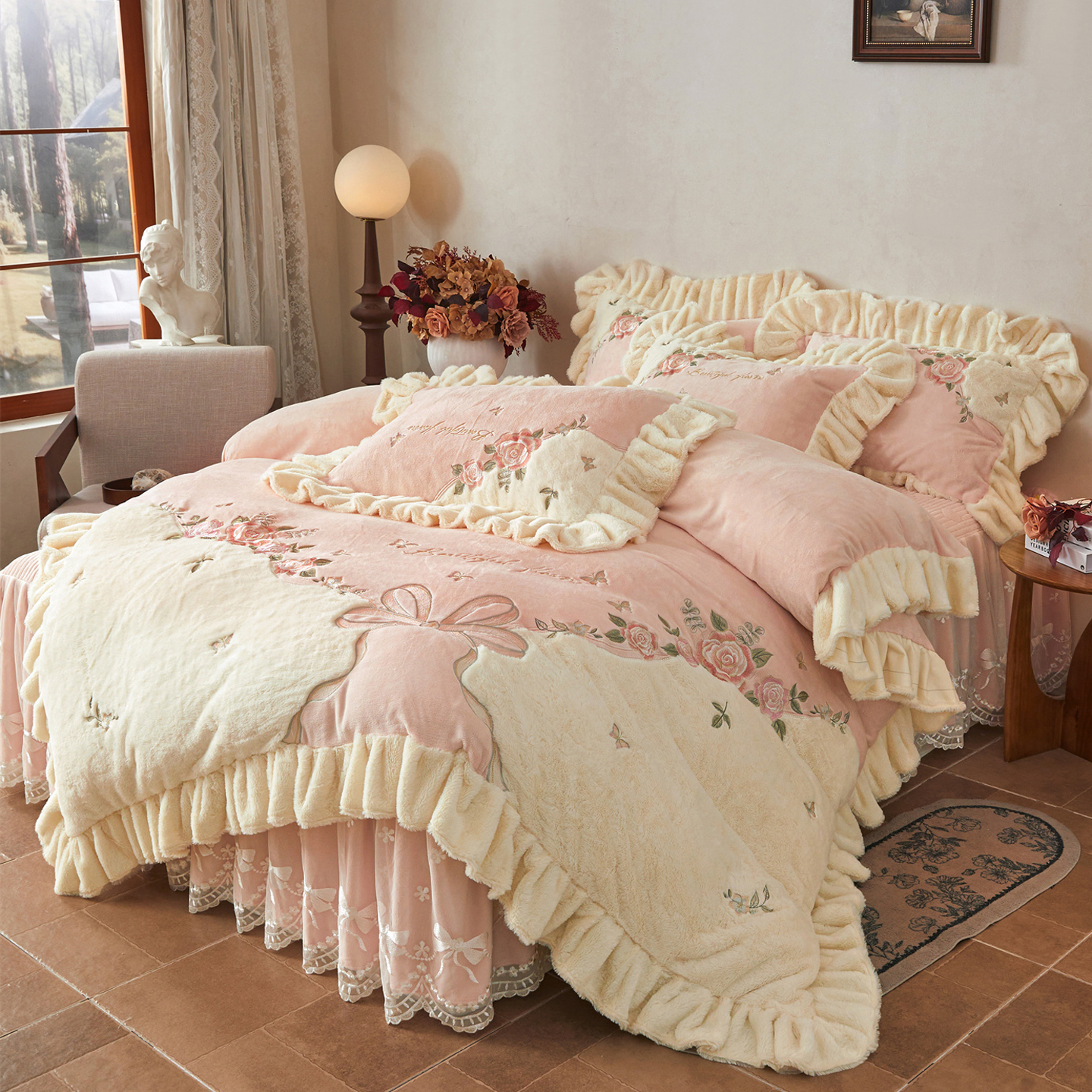 加厚牛奶绒贴布兔绒四件套夹棉床裙款 高端绣花公主风花边被套保暖