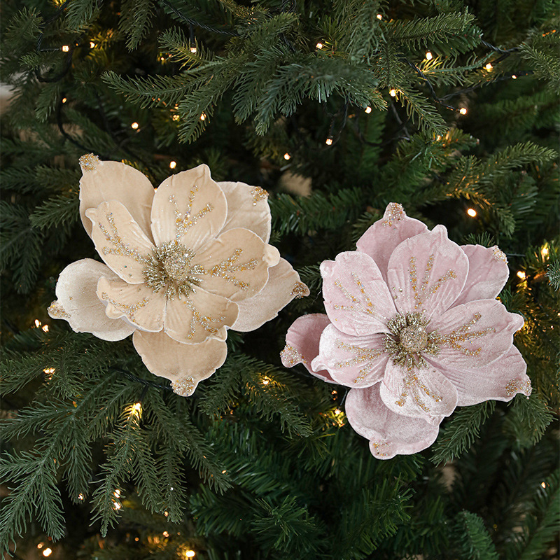 新品 饰品仿真花 24CM粘粉植绒圣诞花玉兰花高档轻奢布艺圣诞节装