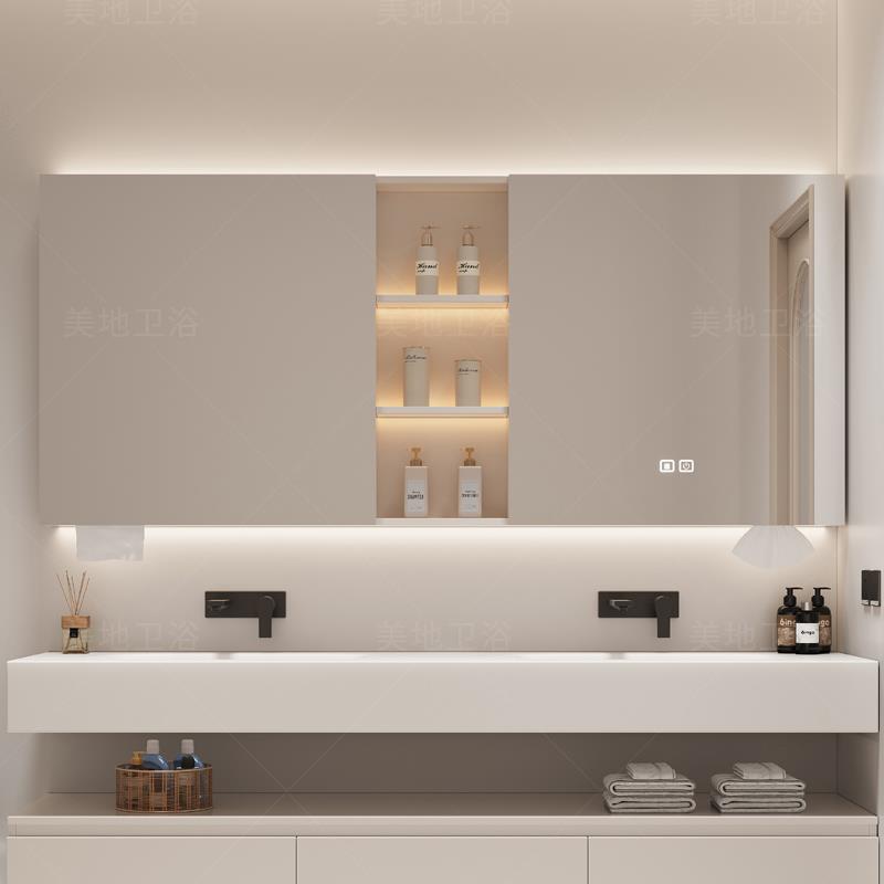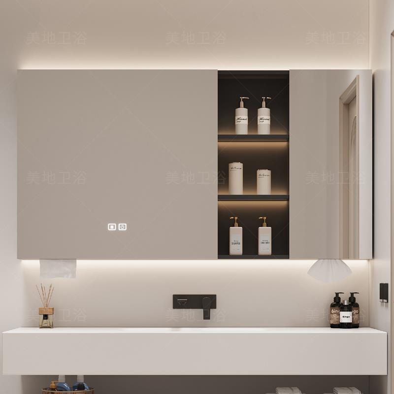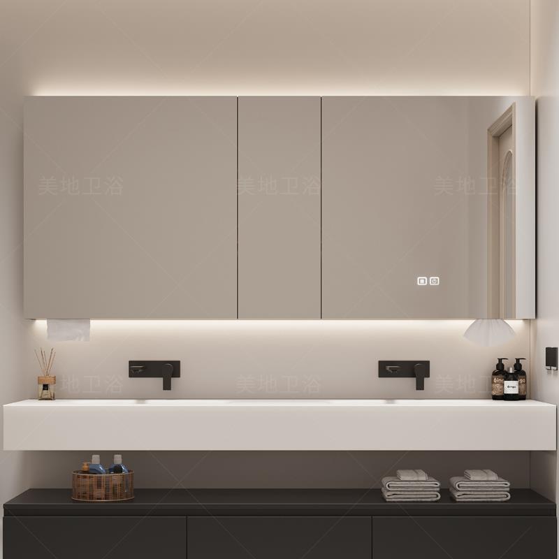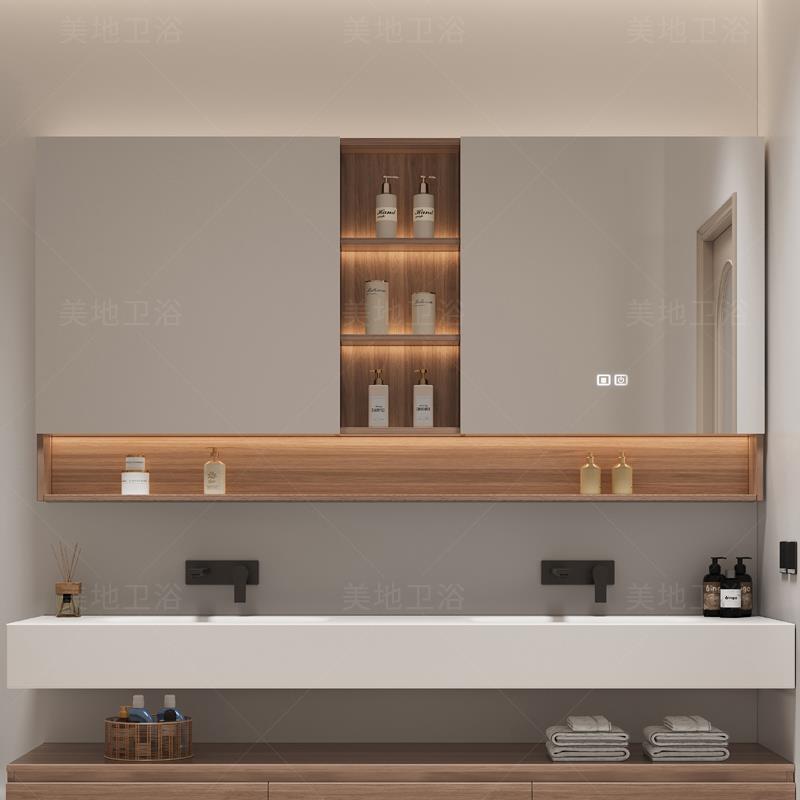 智能单独浴室镜柜卫生间挂墙式 双盆左右边中间开放格收纳镜箱定制