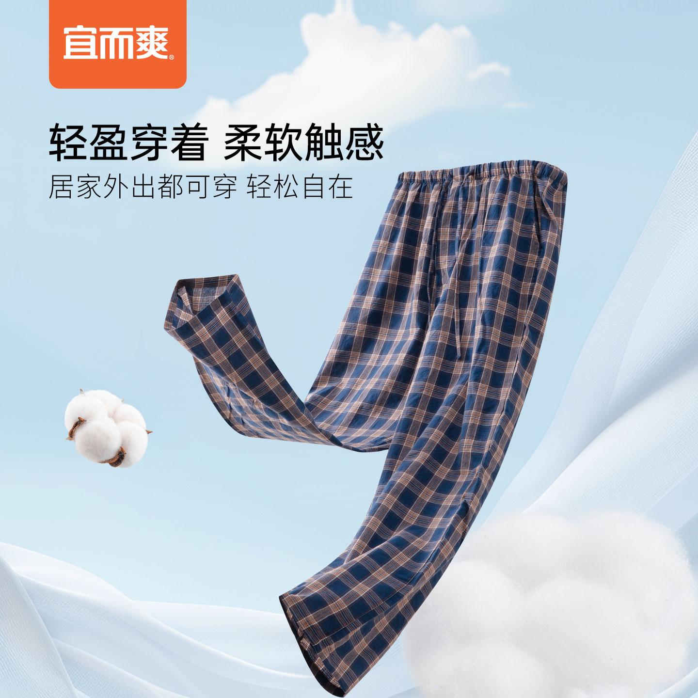 家居裤 单裤 100%棉格子休闲长裤 纯棉可外穿睡裤 宽松大码 宜而爽男士