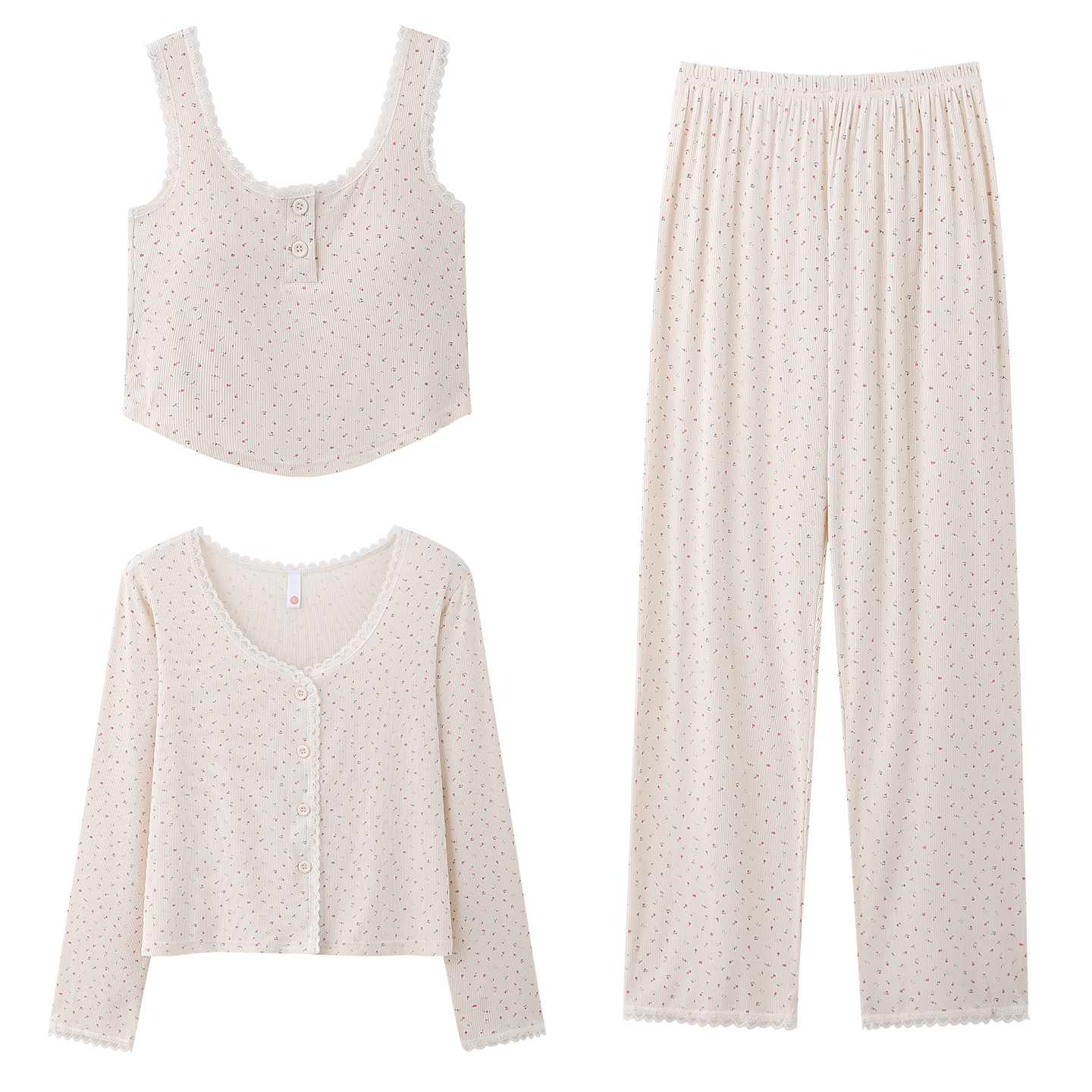 都市丽人睡衣女带胸垫螺纹彩棉2025春秋新款 三件套家居服 吊带长袖