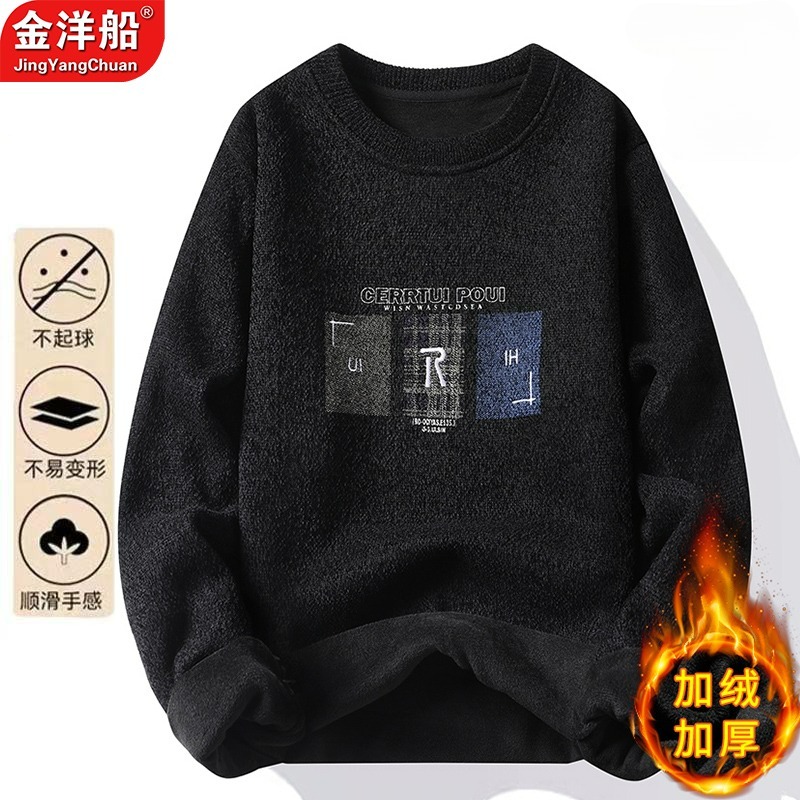 雪尼尔一体绒男装 圆领内搭针织打底衫 上衣 加绒加厚毛衣男士 秋冬款