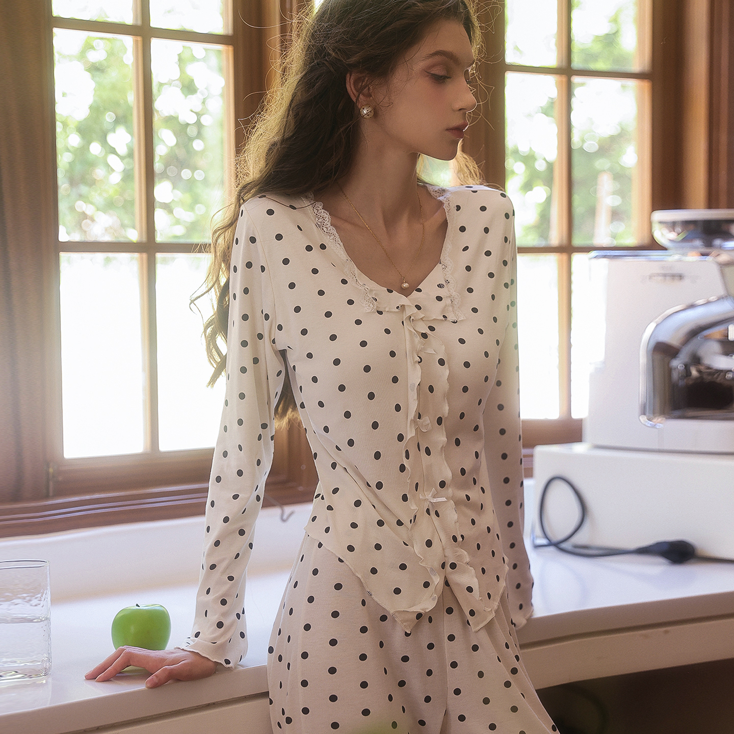 夏何夕性感睡衣女高级感波点蕾丝边长袖 两件套家居服带胸垫 长裤