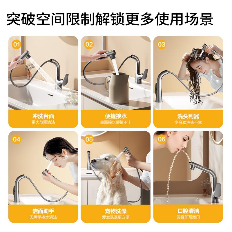 九牧卫浴洗手盆冷热抽拉枪灰面盆龙头浴室卫生间可升降水龙头家用