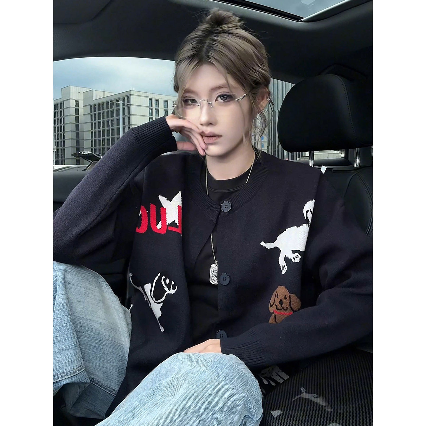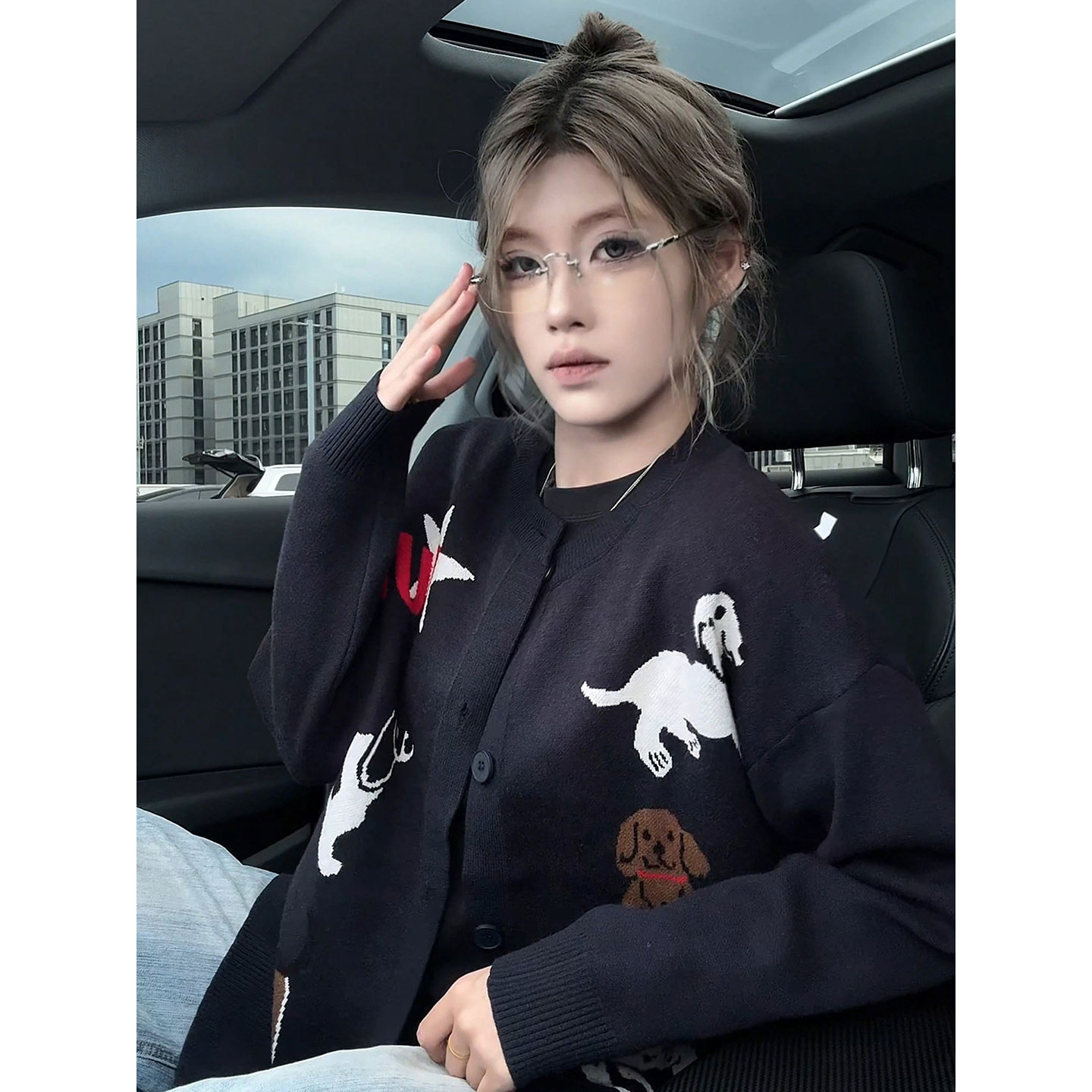 外套慵懒风情侣夹克 黑色针织开衫 cleanfit小狗提花毛衣男女款 秋季