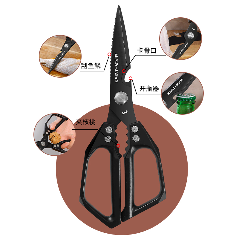 日式 sk5厨房剪刀家用黑钛不锈钢多功能剪鸡骨头杀鱼专用剪子