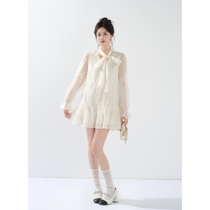法式 高级感荷叶边打底直筒裙子 气质名媛蝴蝶结雪纺连衣裙女早秋季