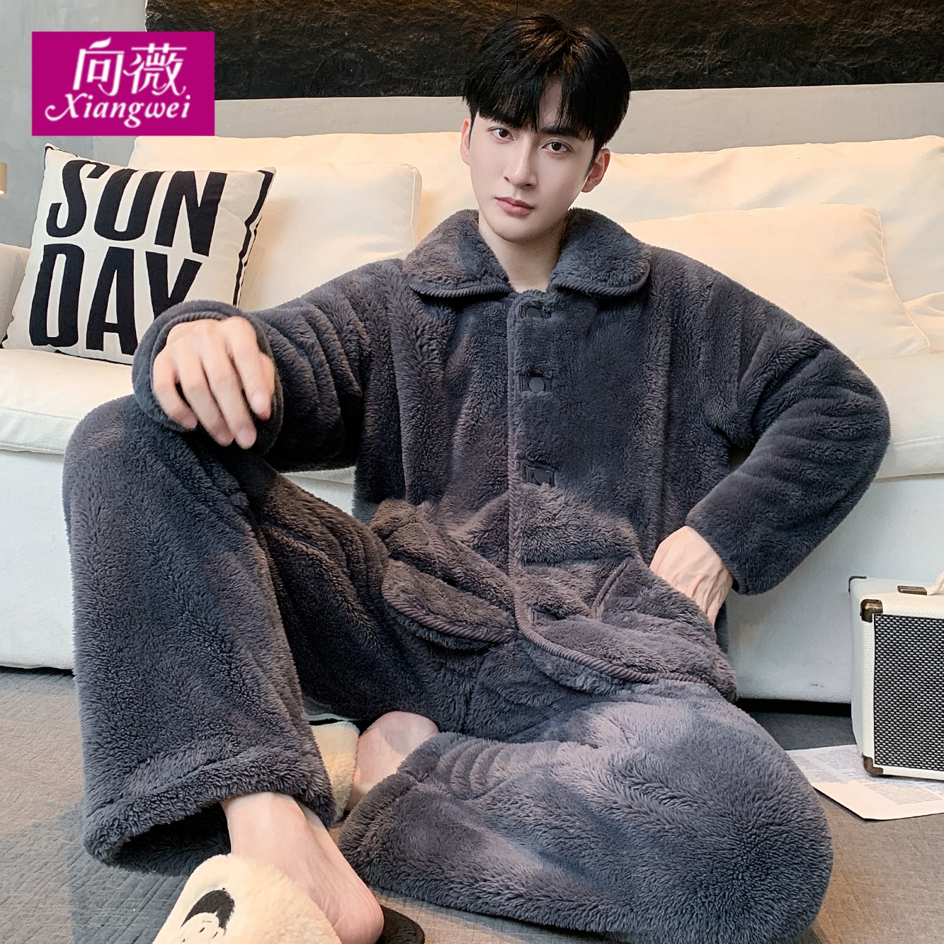 简约休闲法兰绒睡衣套装 秋冬新款 蓄热保暖雪花绒家居服可外穿男士