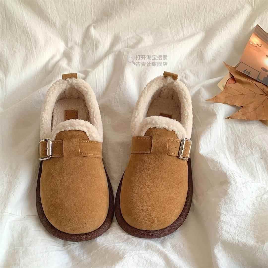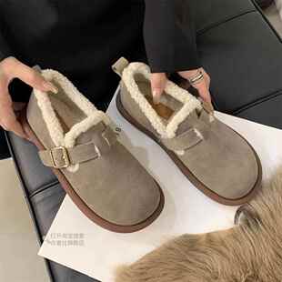 外穿平底复古软底勃肯大头一脚蹬棉鞋 秋冬季 女加绒乐福鞋 豆豆鞋 款