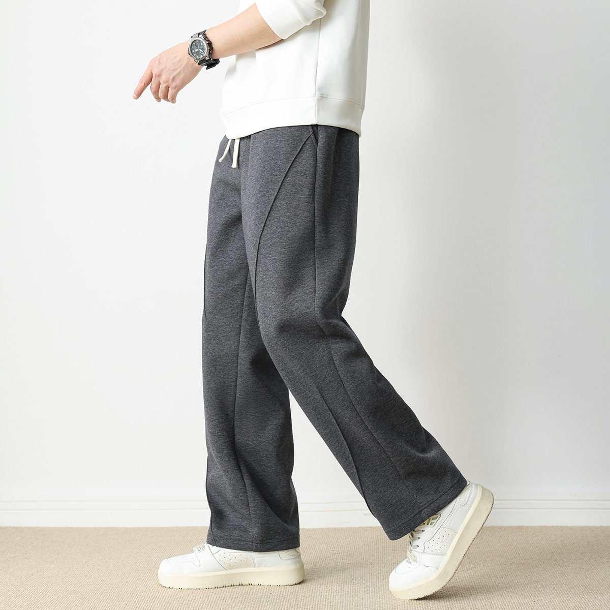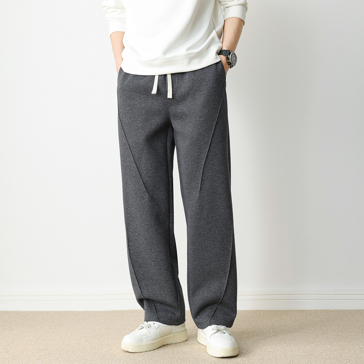 MOCO休闲裤 软糯风 含绵羊毛抽绳松紧高腰立体中线长直筒宽松运动裤