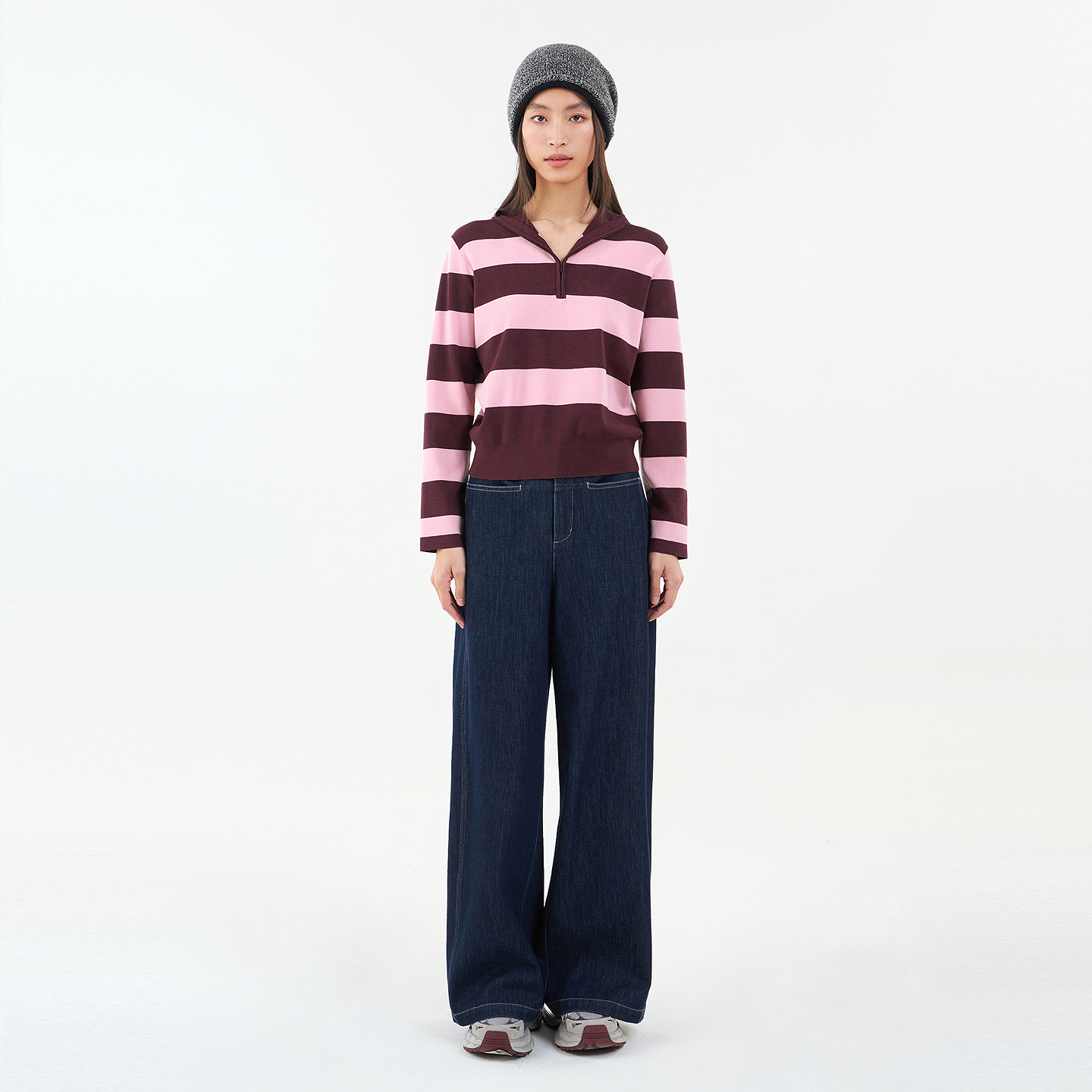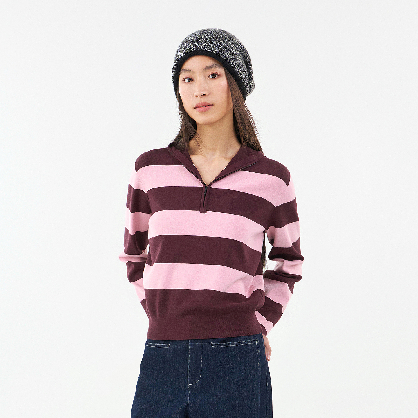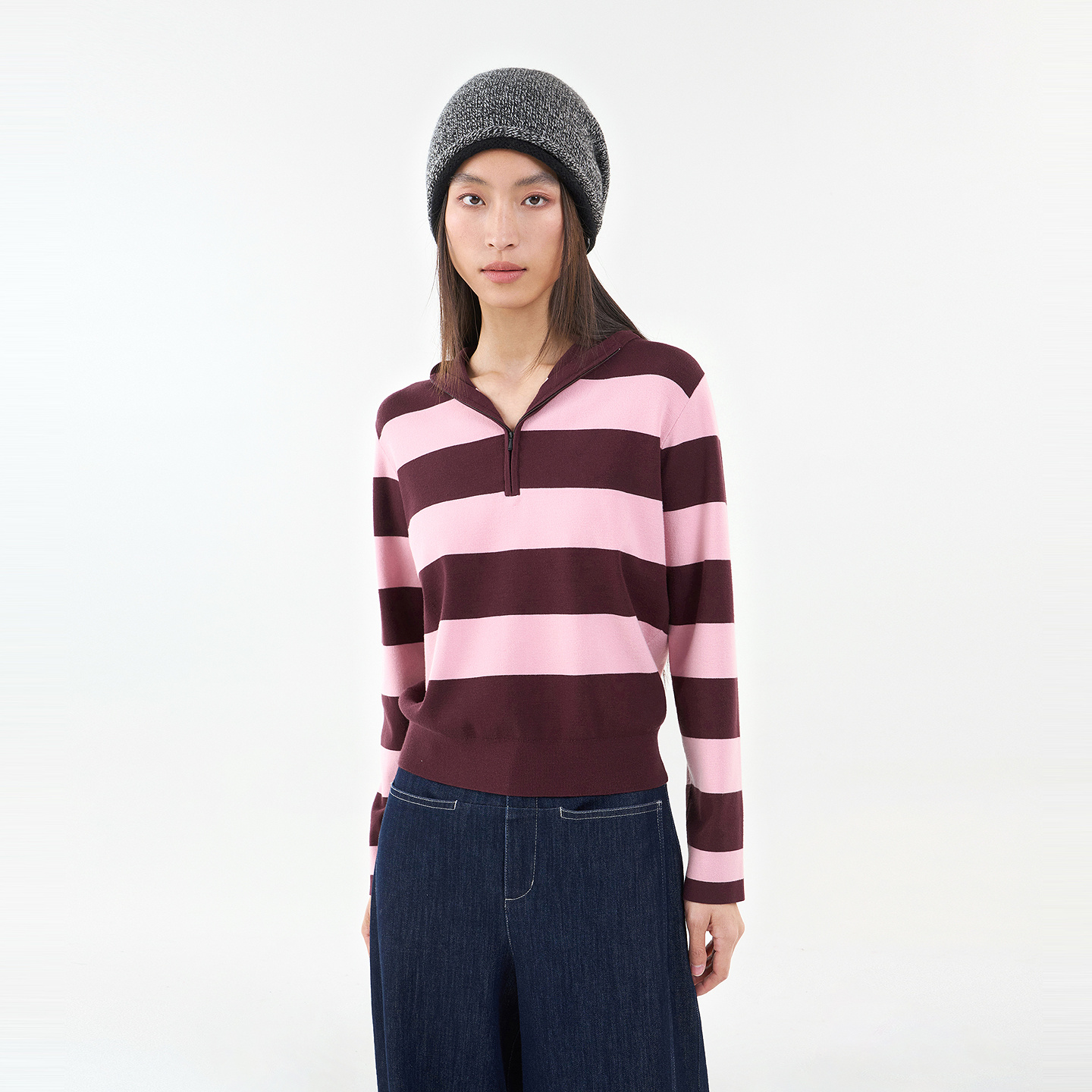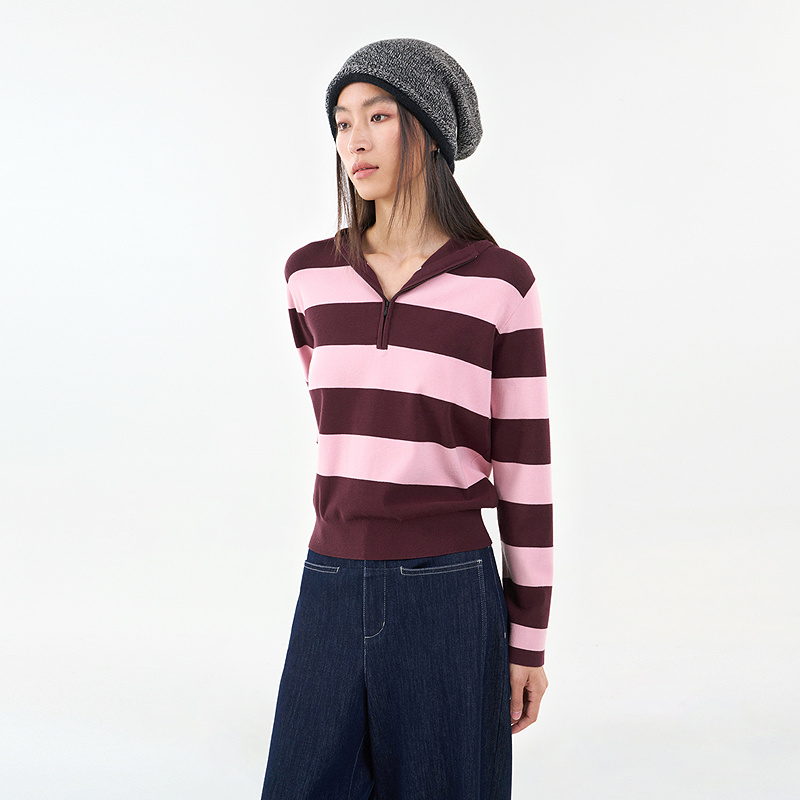 易菲半开领条纹连帽宽松短款 Yifini 针织卫衣百搭上衣 专柜同款