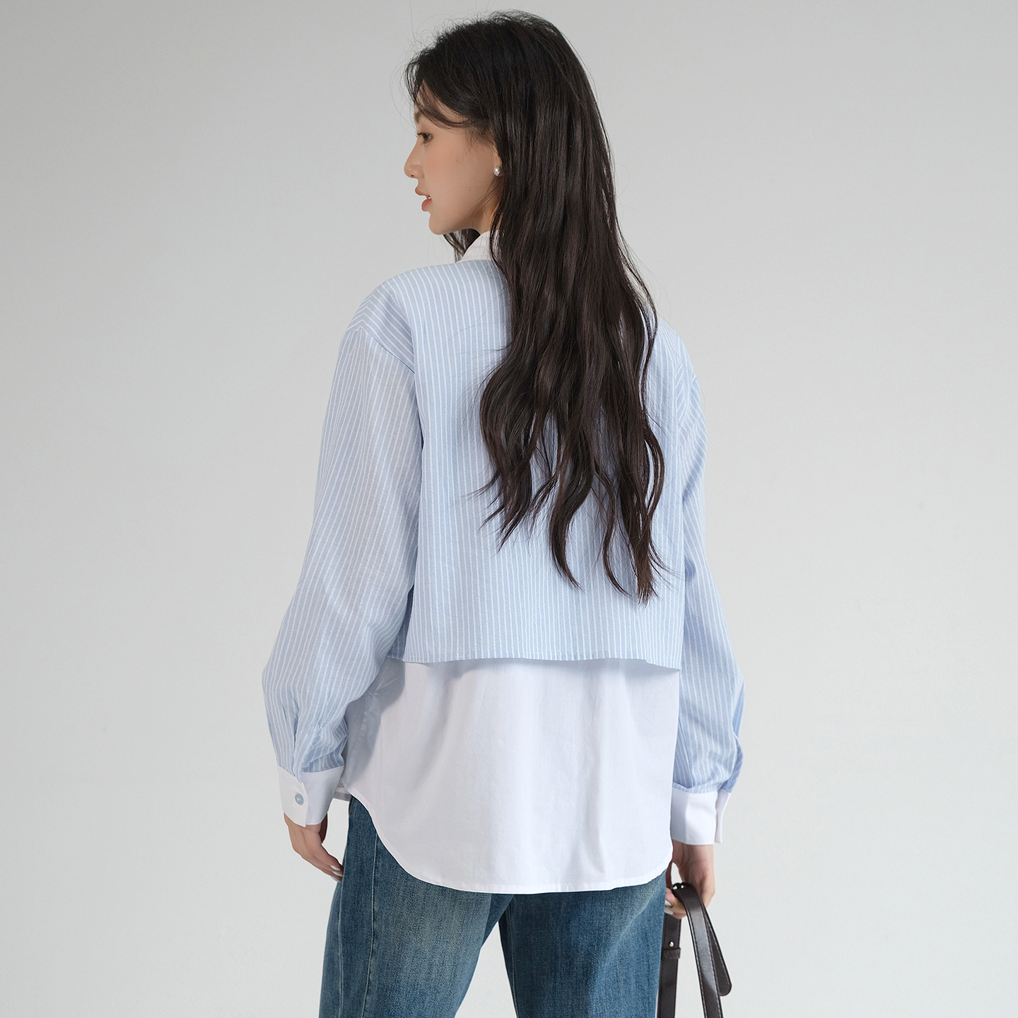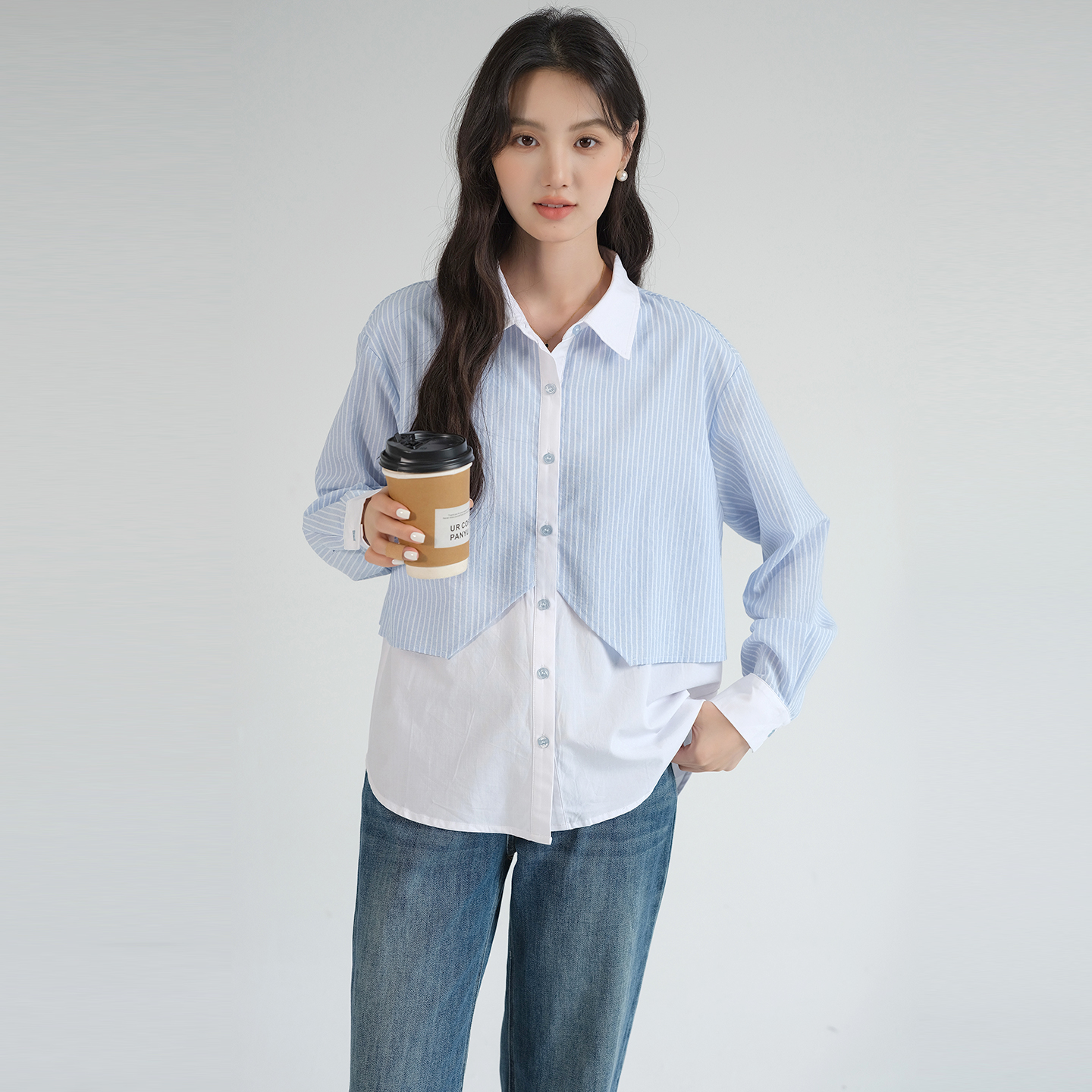 2025秋装 蓝若水大码 新款 时尚 通勤上衣 韩版 条纹拼接假两件衬衫