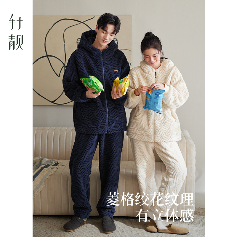 珊瑚绒加厚男家居服套装 羊羔绒情侣连帽睡衣女冬季 抗静电 轩靓