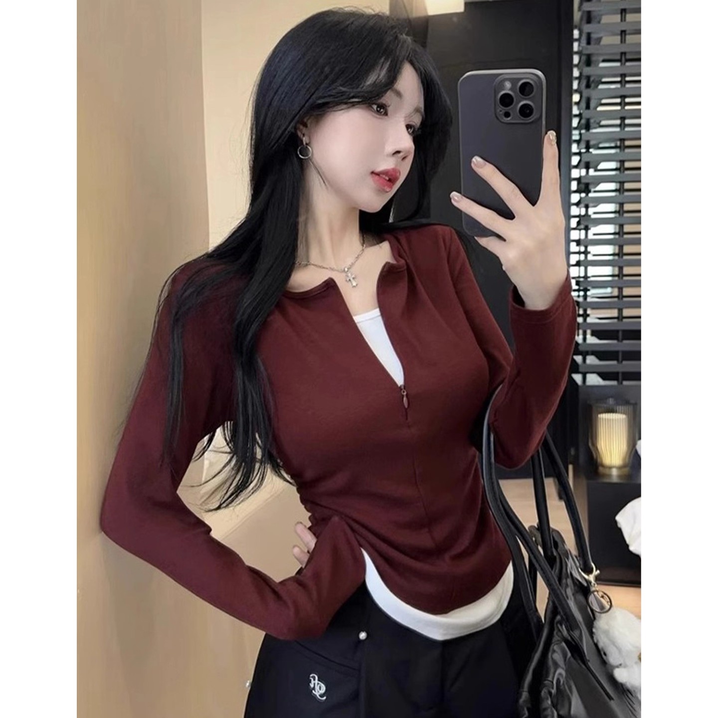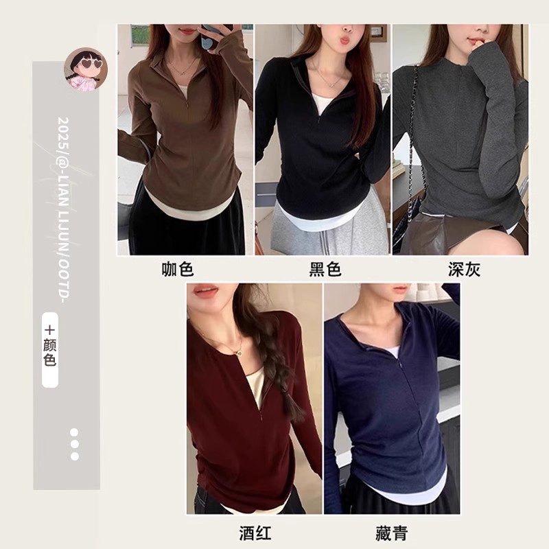 正肩显瘦假两件打底衫 安可拉红上衣女秋季 t恤修身 v领长袖 2025新款