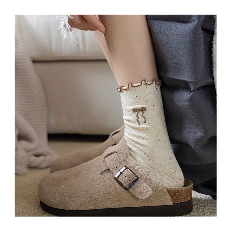 点子纱花边蝴蝶结堆堆袜子女2025新款 纯棉中筒袜通勤甜美长袜黑色