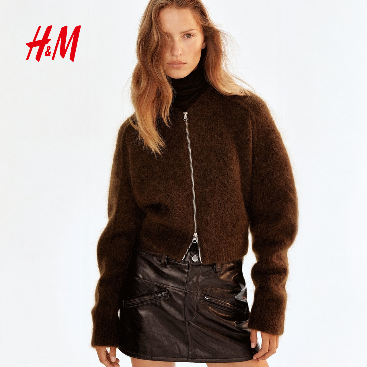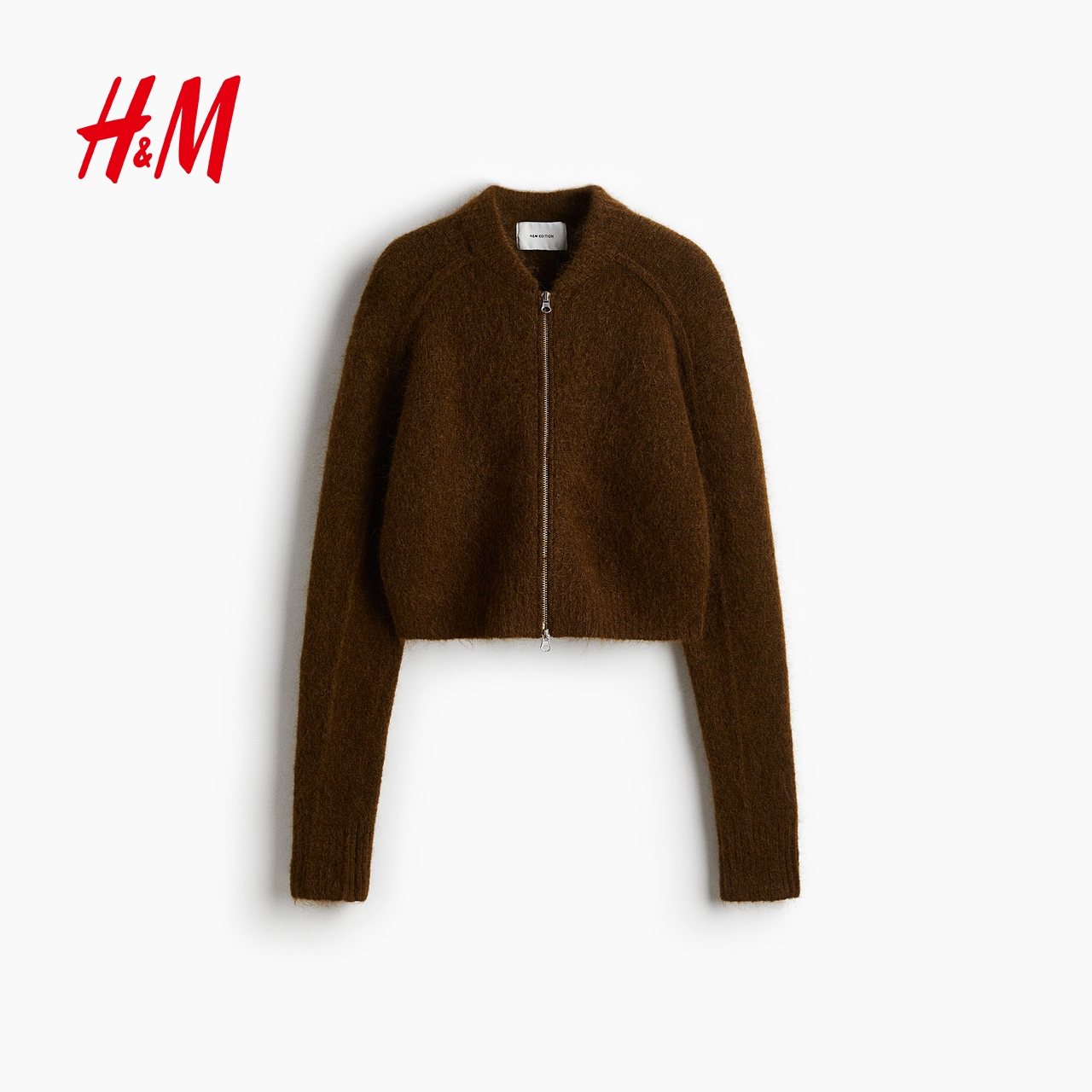 V领马海毛混纺宽松拉链开衫 HM女装 新款 2025秋季 1310686 毛针织衫