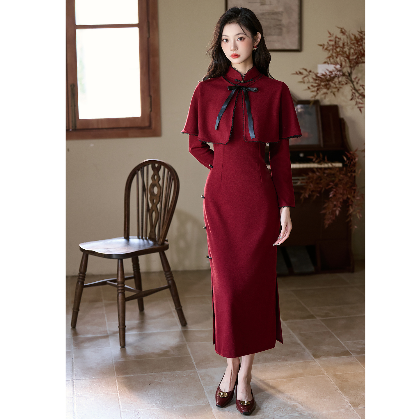 细语岁月 灰色蝴蝶结盘扣旗袍连衣裙开衫 秋季 新中式 女 新款 乔拉
