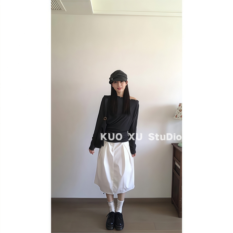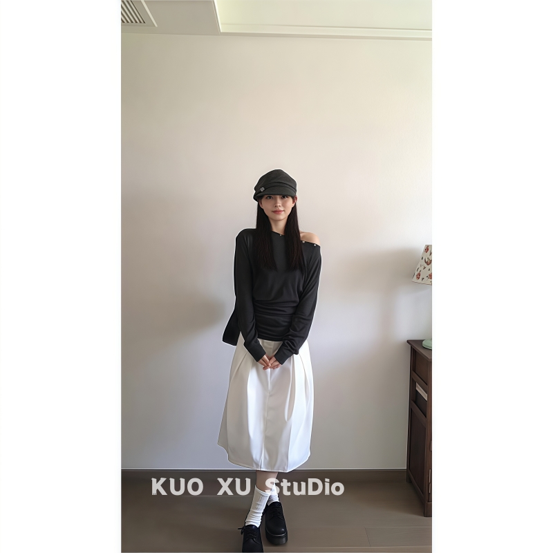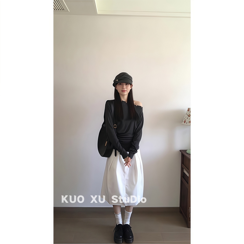 2025超火穿搭一整套温柔气质露肩长袖 T恤收腰显瘦上衣高腰半身裙