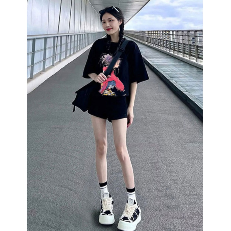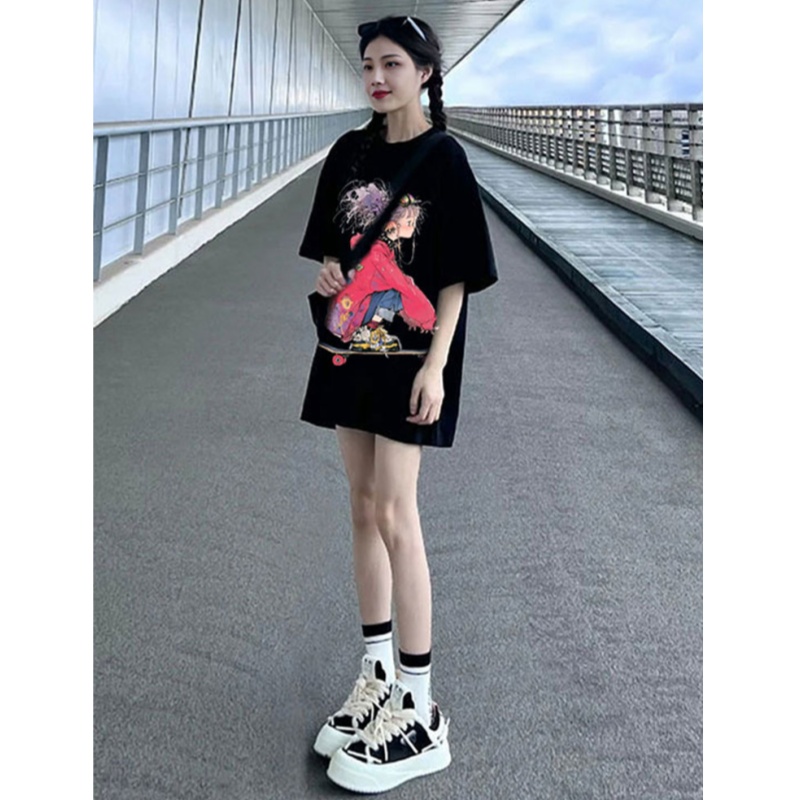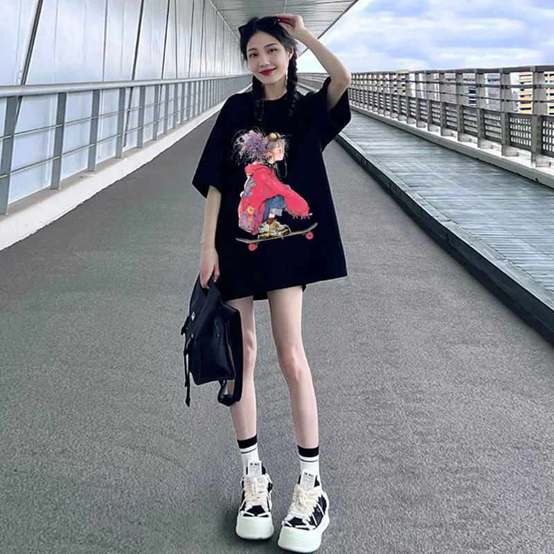 遮屁股设计感印花大版 中长款 夏季 女t恤2025新款 宽松上衣 黑色短袖