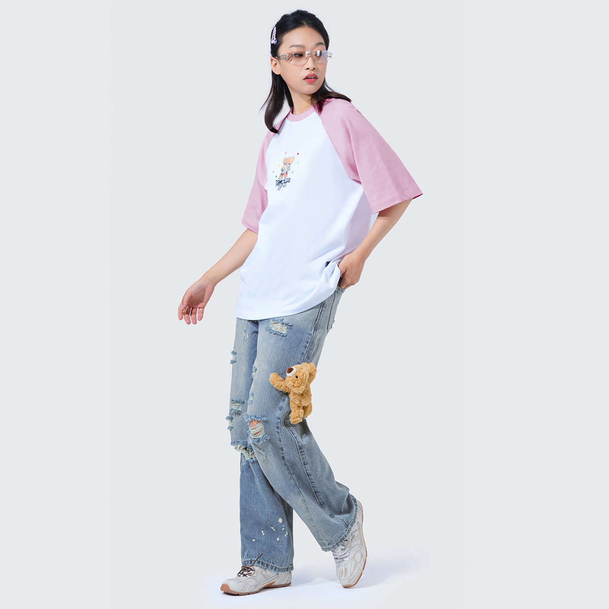 圆领宽松百搭正肩T恤女 新款 TSMLXLT粉色拼接小熊印花短袖 2025夏季