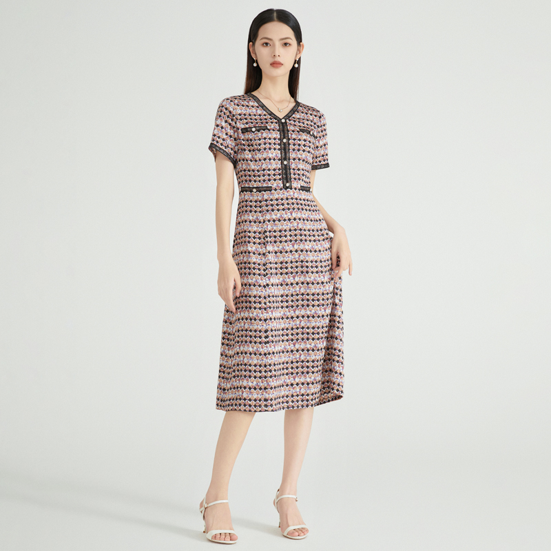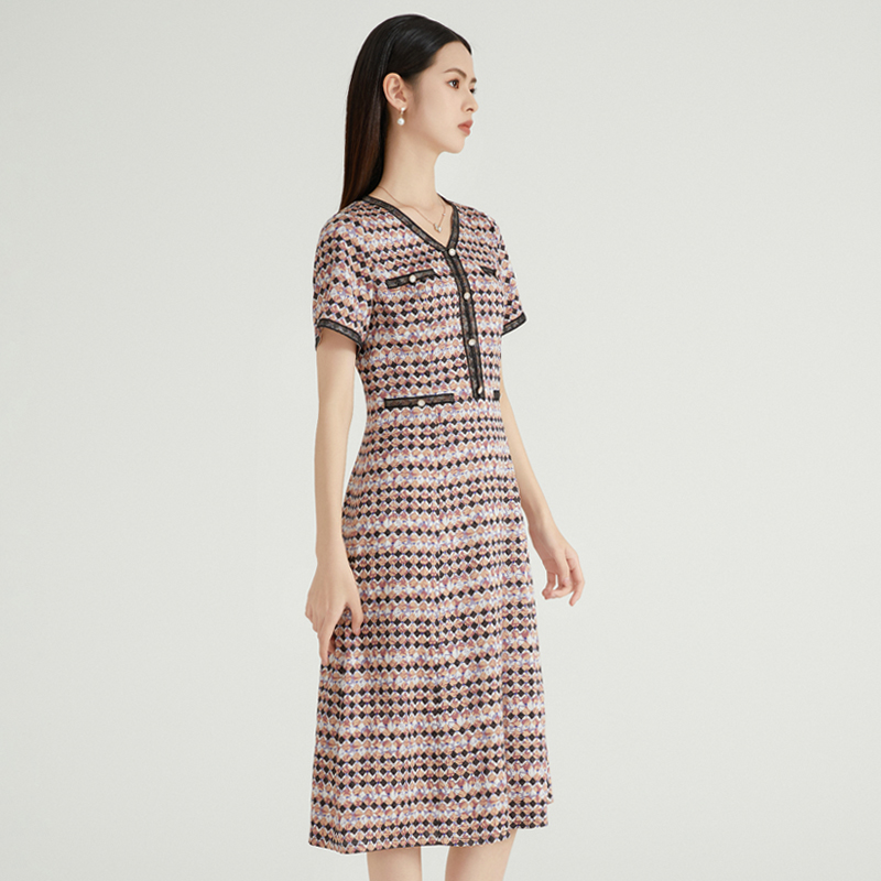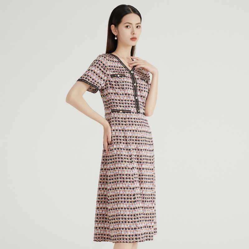 气质时尚 马天奴春夏新款 黑色V领印花连衣裙收腰礼裙淑女约会短袖