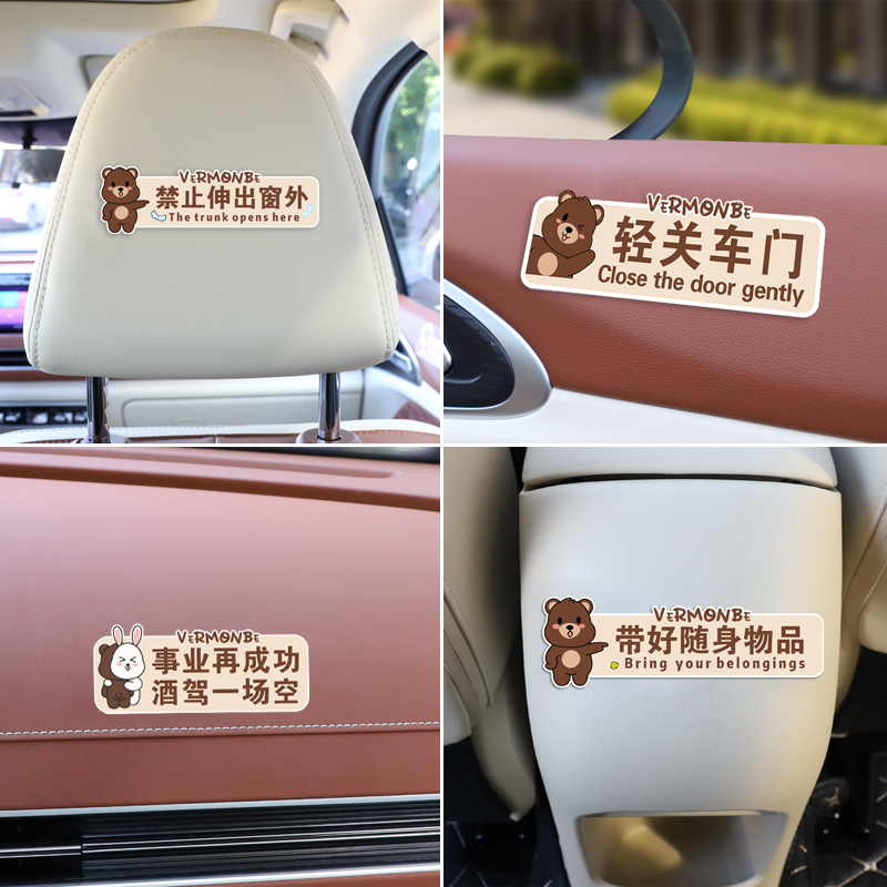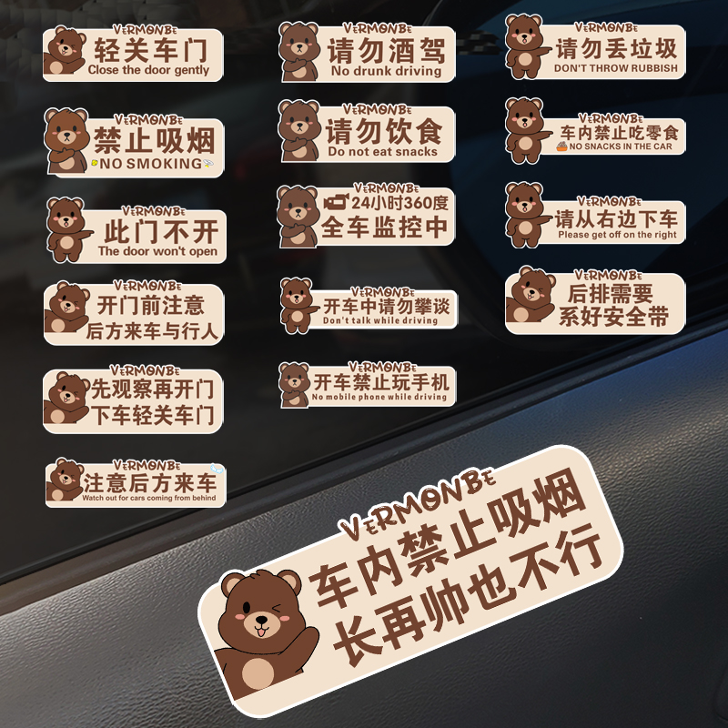 维维熊车贴系好安全带禁止吸烟开门前注意后方开提示车内文字贴纸