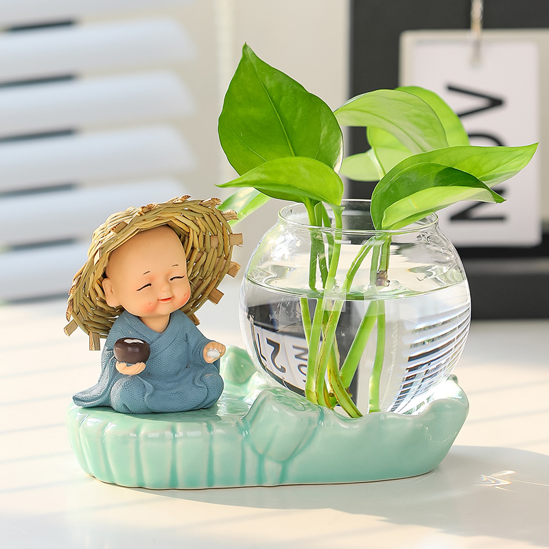 草帽小和尚绿萝水培花盆器皿花瓶客厅玄关柜办公桌面装 饰家居摆件