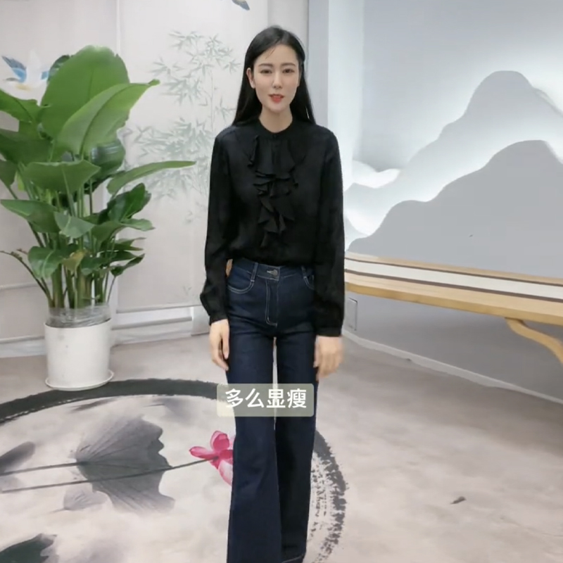子气质微喇通勤棉质显瘦女裤 高腰弹力深色长裤 百搭休闲牛仔裤 修身