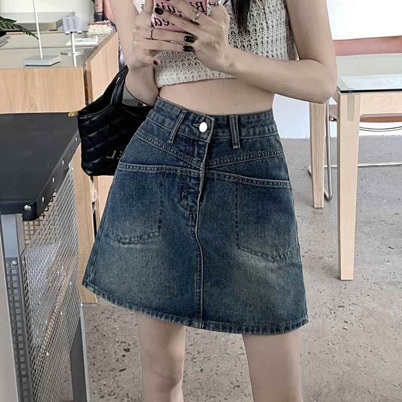 辣妹a字牛仔短裙女夏季 ins风分割口袋设计感高腰包臀半身复古裙子