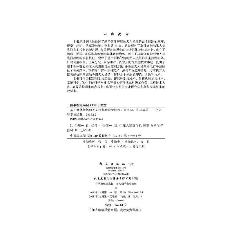 基于群体智能 科学出版 无人机集群自主控制 邱华鑫 社 段海滨 全新正版