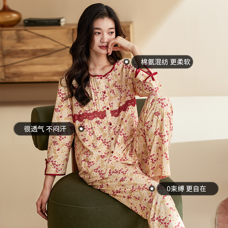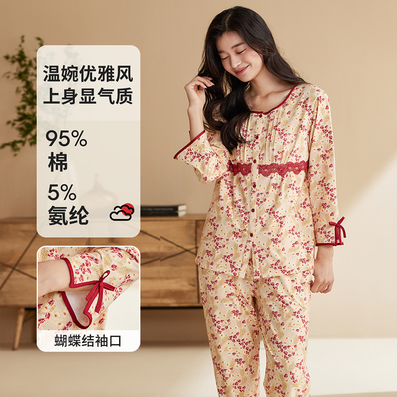 可外穿家居服套装 纯棉睡衣女春秋圆领印花九分长袖 超柔软 秋鹿
