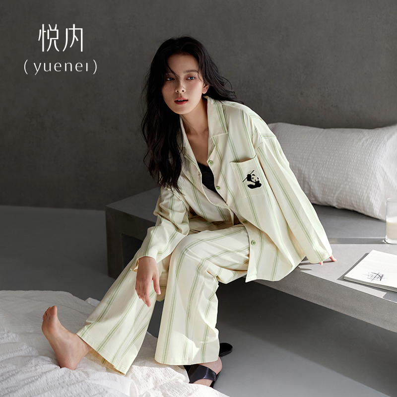家居服熊猫国潮休闲条纹可外穿 纯棉质长袖 悦内睡衣女士春秋季 春款
