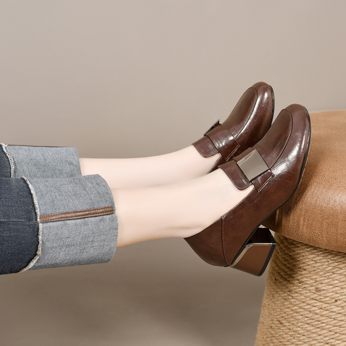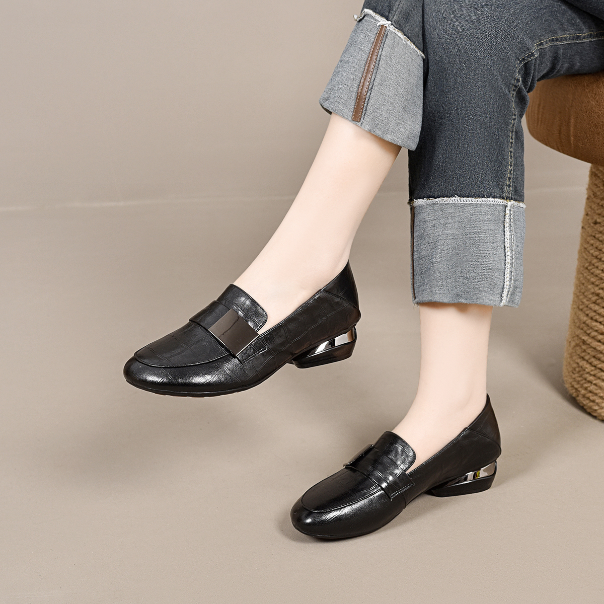 单鞋 乐福鞋 百搭时尚 春夏高跟方跟女鞋 5新款 女鞋 昔子7031 豆豆鞋